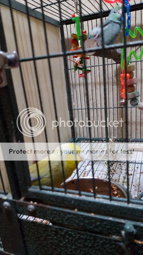 The second pair are comical. I think they are so amusing to watch. The male is a yellow, and his name is Sunny. He seems to be a pretty laid back bird and just goes along with whatever his mate decides. Not the best picture, but he is in the bottom left on the food dish.