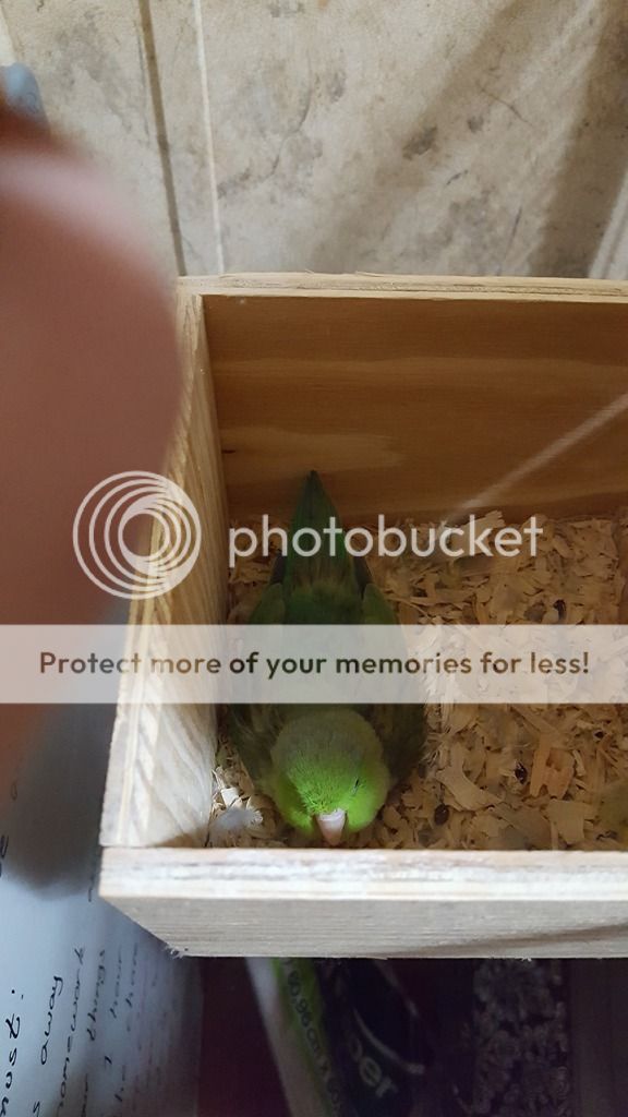 I've had the pairs for about a month now. I have one pair that is currently sitting on six eggs, and I hope that is all she is going to lay. Not that I wouldn't like more babies, but I think it starts to be too much on mom when they lay giant clutches. So here is a picture of mom, I named her Allison, and she is sitting tightly on her eggs like a good mommy should.