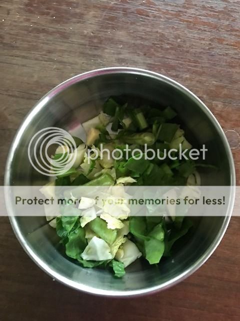 Now, keep in mind, I feed him just fine, but he's on a vet recommended weight loss diet. He gets pellets, a tiny bit of birdie bread, and lots of fresh veggies. This is what was in his bowl at the time: