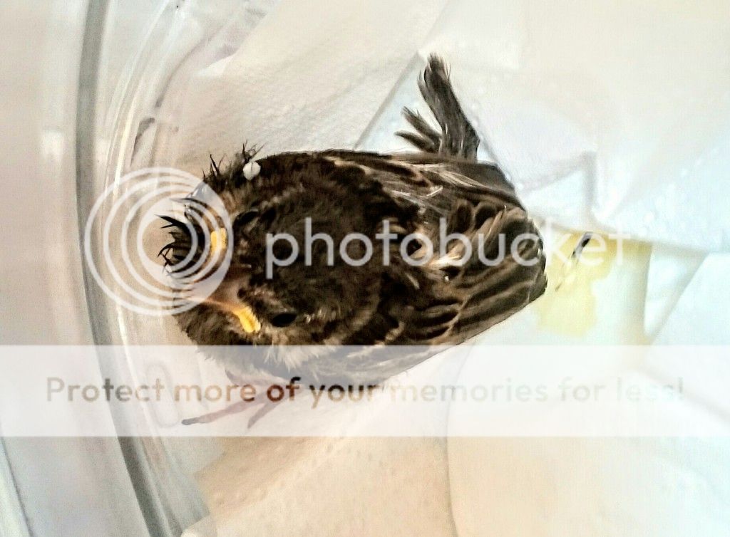 Yesterday I was in London for some training for work. On the way back on the train, my partner messaged me to tell me he had the sibling sparrow in his possession as he'd found it in the alleyway (note: alleyway full of cats). So rather than leave the poor thing to be mauled to death, he brought it in, and put it in the top part of our vegetable steamer (like a little plastic box). He knew he shouldn't really bring it into the house because of the parrots, so swiftly took it upstairs. He Googled what to feed it.