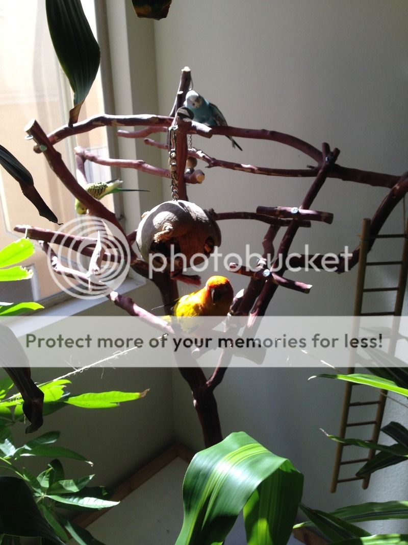 ... and here is Boomer drying in the sun with Kiki (Yellow) and Pewpew (blue) and Pewpew (blue). They all like to join me in the shower. I leave the bathroom door open so they can fly in. Boomer would be on my shoulders before long. The budgies, then they feel like it, would wait for splashes on the bathroom perch or just perch atop my head if they want the full experience. Not today though: