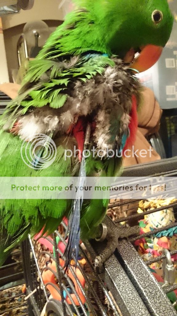 Gerry has broken a bloodfeather. It was the only long one on that side so I think he just managed to break it on the bars of his cage or something.