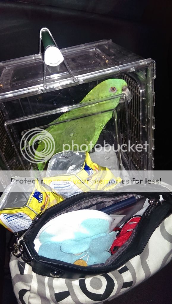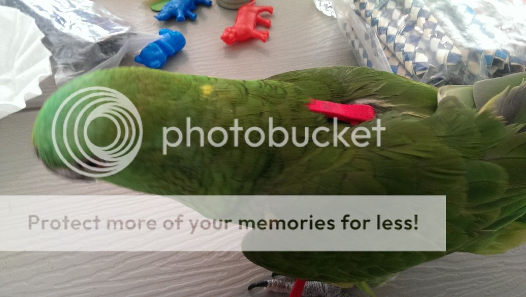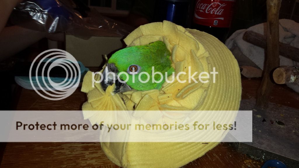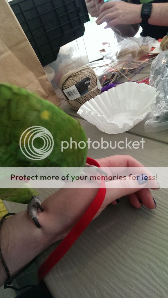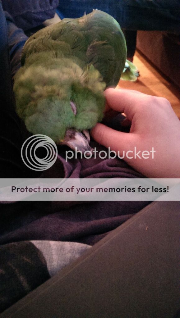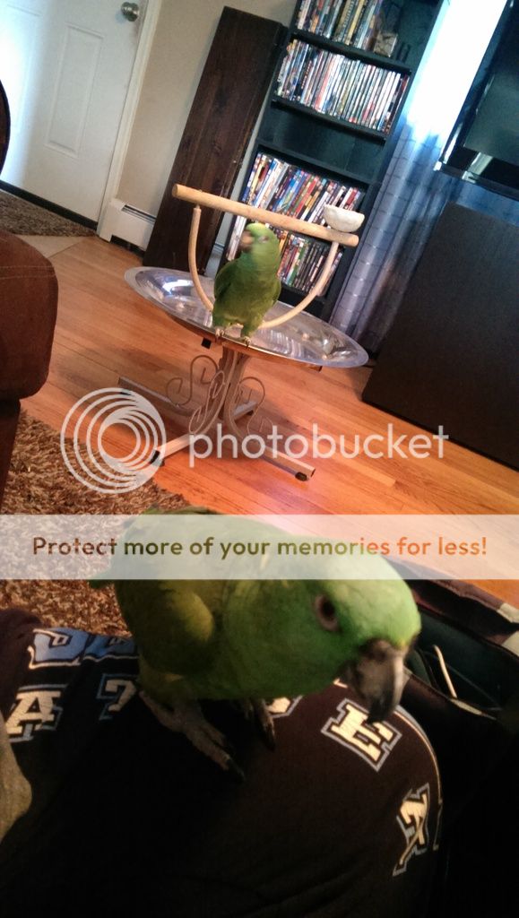 Kelly is the one sitting with me and the far one is my boyfriends yellow nape Fiona. So far Kelly is very unimpressed with her lol