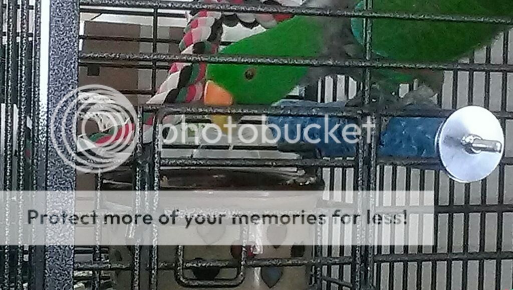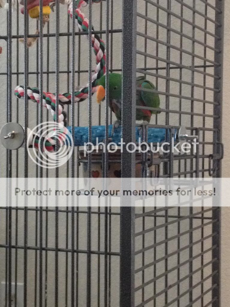 Also I heard him make his usual soft sounds this morning! He was just chatting back and forth with me and Brad. Makes me happy to hear him chattering again. Also before we left we swapped the position of his pellet bowl and his water bowl, which lead to him drinking water(I guess he lost it in all the new perches.) and exploring the other perches he has yet to sit on. He seemed to like sitting on the big tree branch perch that's in there.