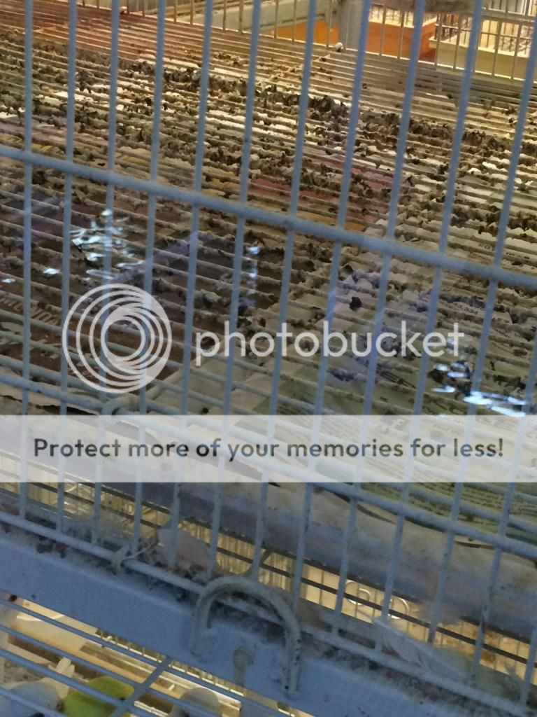The bottom of the finches cages are caked with feces, let me take that back ALL the cages look like that. I see at least 5-7 parakeets on the ground huddling because there is no room for them having to be pooped upon. Especially today, where one was lying on the ground.