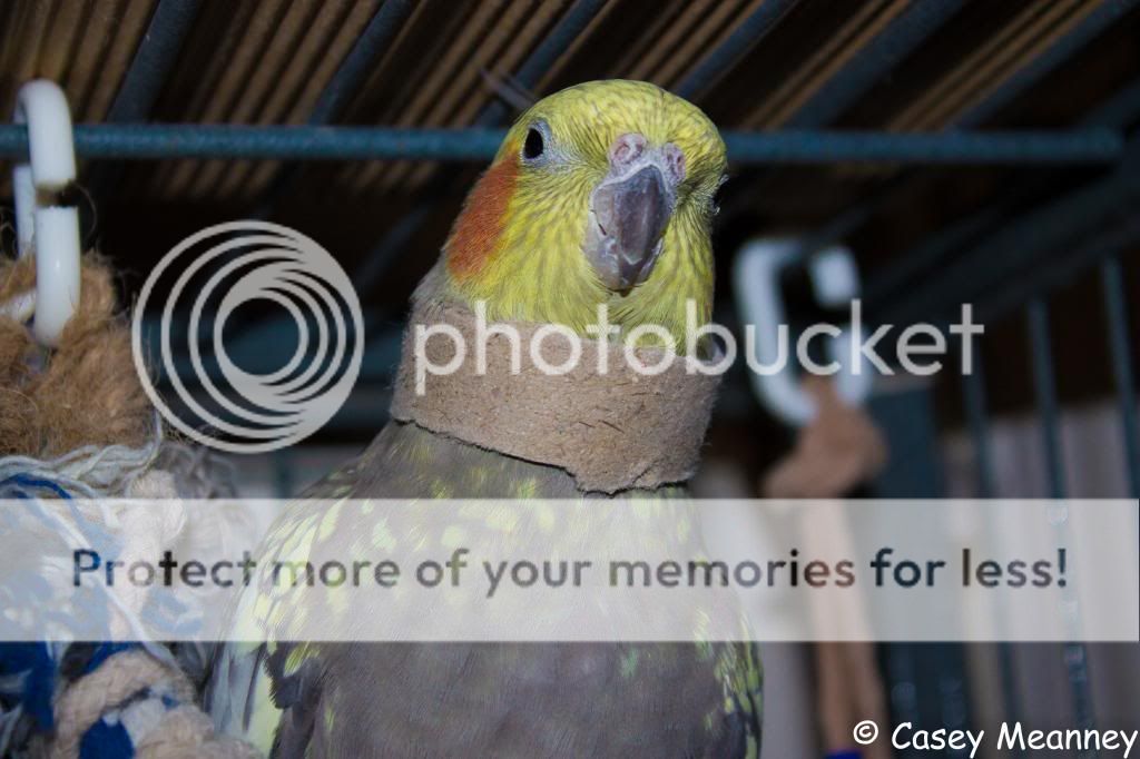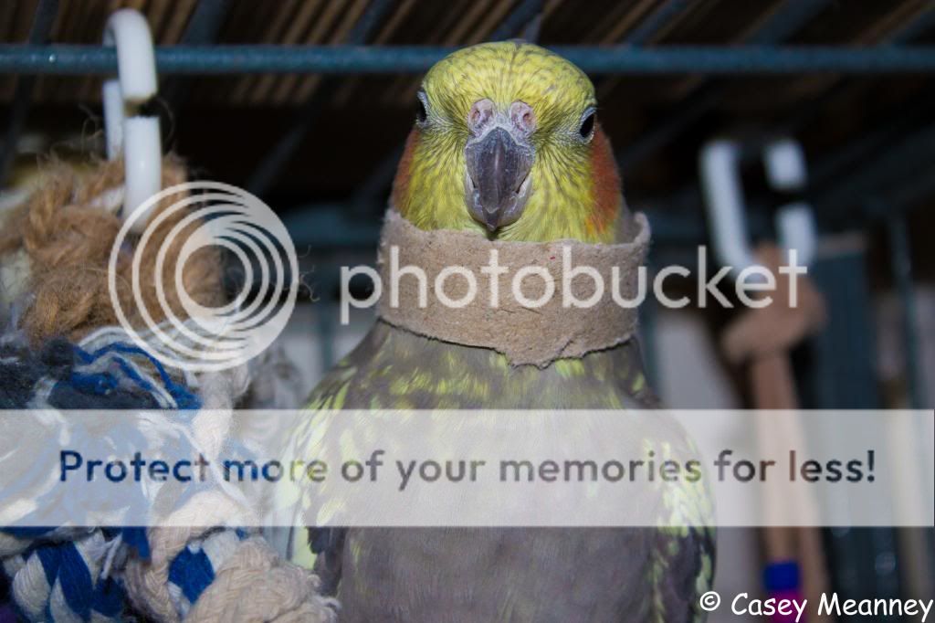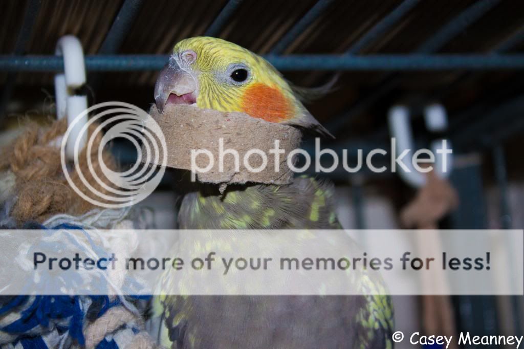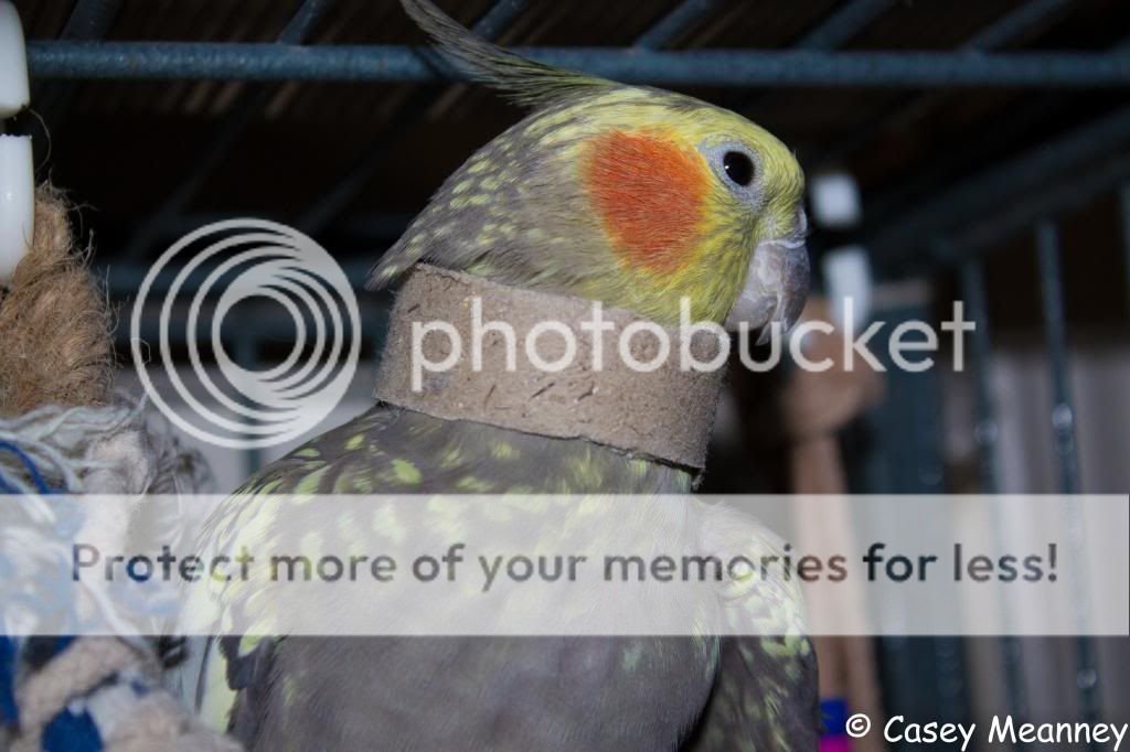 i went to put the cockatiels to bed. i saw dally and she looked funny. she took a cardboard tube ring and put it around her neck and was wearing it like a necklace lol