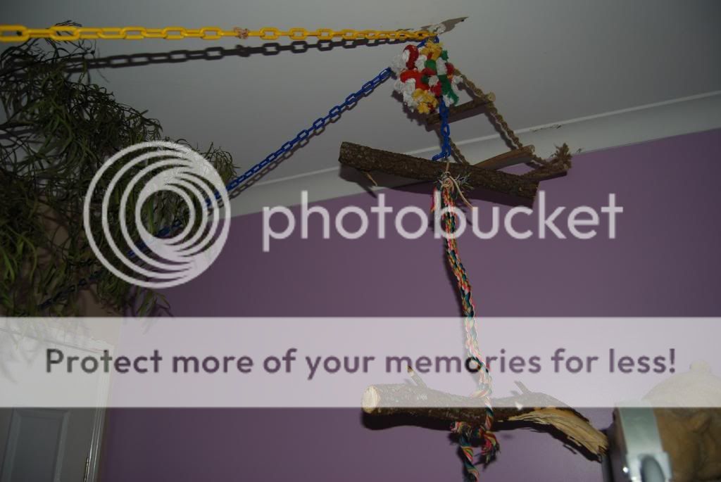 Then the natural ladder which is covered by eaves, he will sit there and swing when hes very very hyper, and the vine thing he bounces on..