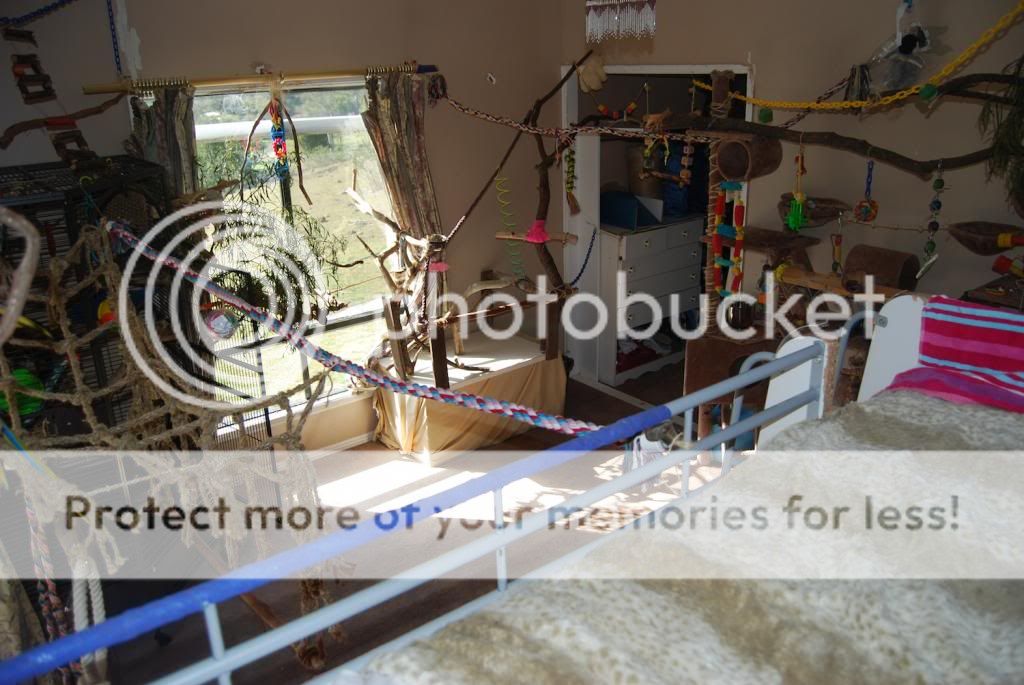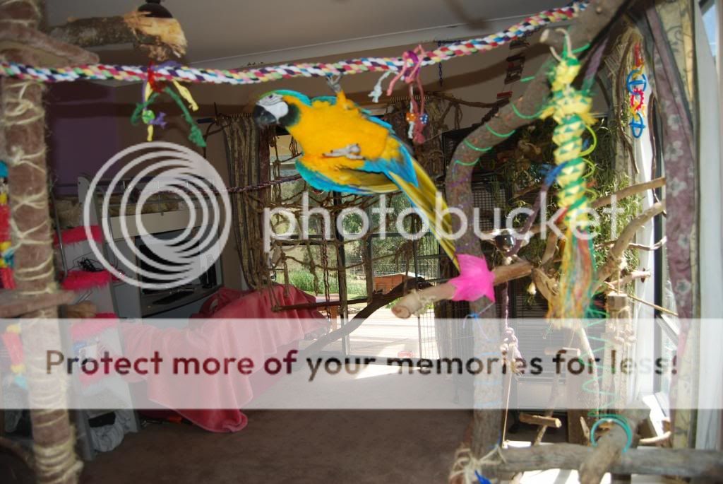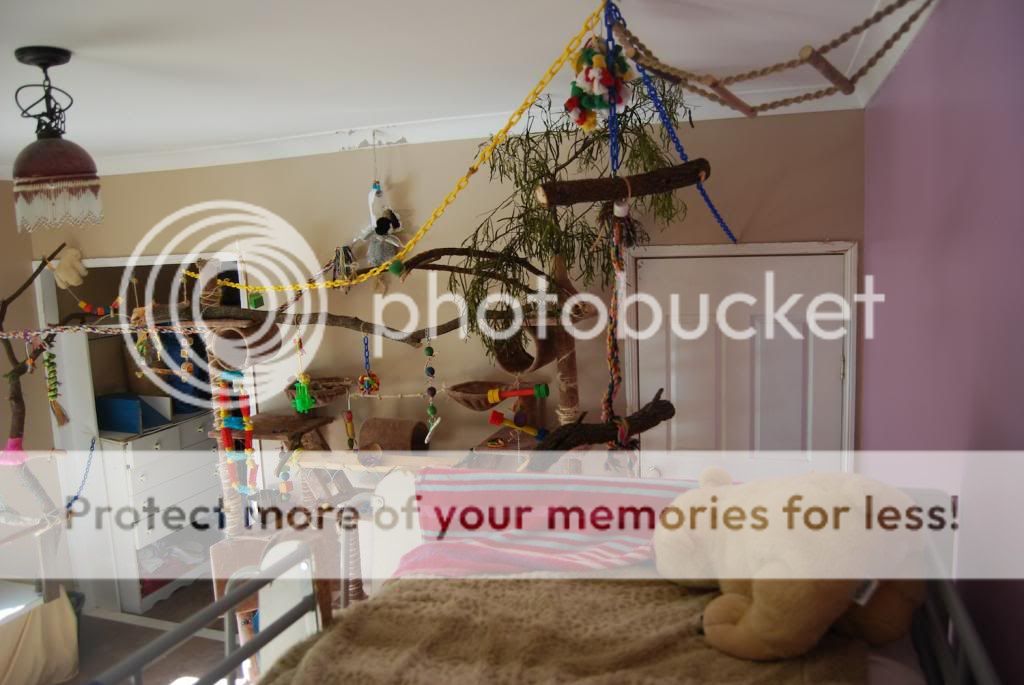 and underneath his cargo net is just a wooden branch where he chills and plays with some foot toys, or he sometimes sits there looking out the window singing to himself!