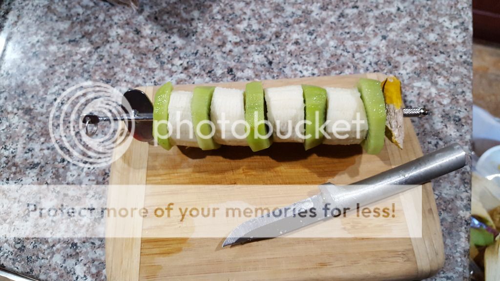 So I made the pretty chicken a fruit kabob this morning with kiwi and banana.