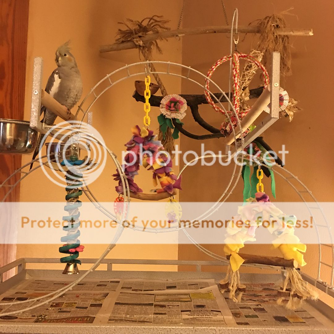 The yellow swing is the perfect size for a cockatiel. It has a crepe myrtle perch and crepe myrtle slices tied with sisal.