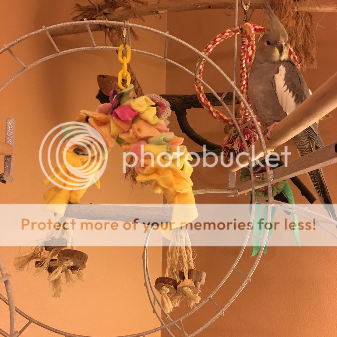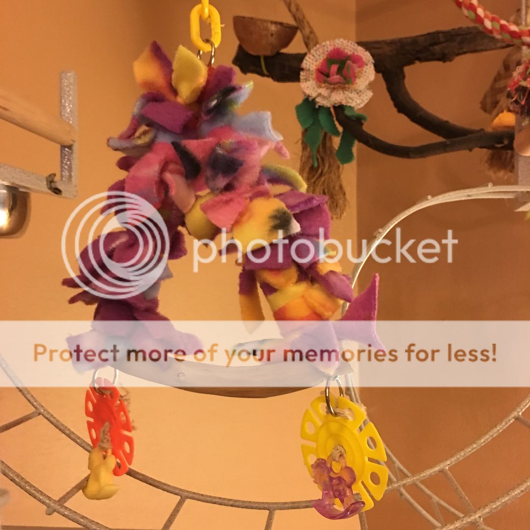 Sweet Pea has a couple of fleece swings to pass along to a friend. I made them from spare parts the last time I made swings for quakers and Toos. Sweet Pea has her orb swings and doesn't like the fleece one.