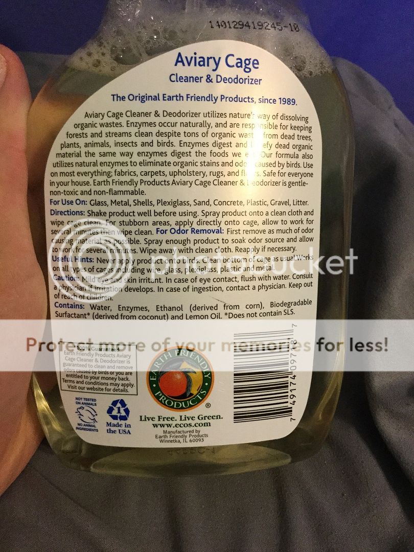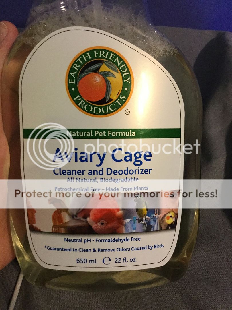 I got this from Woodmans the other day while I was grocery shopping, I have seen it there for a long time but I figured I would give it a try, it works good on getting poop off of things, but the only thing that concerns me is that it smells lemon scented, it is fairly strong right when you spray it but the scent goes away quickly. I was just wondering if anyone has used this product before or knows if it's safe. I had the birds out on the porch while I sprayed this, but you are supposed to be able to use it around birds. But yeah, I just want to know if anyone has experience with this product.