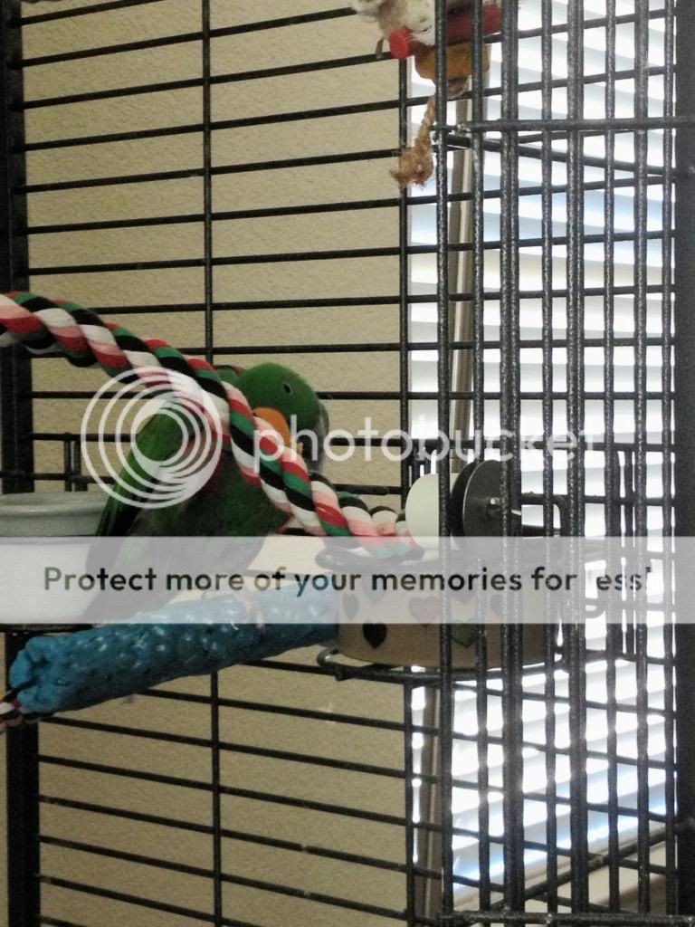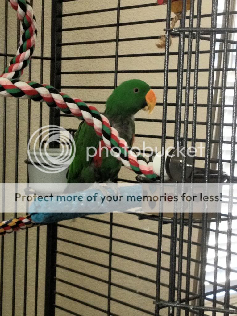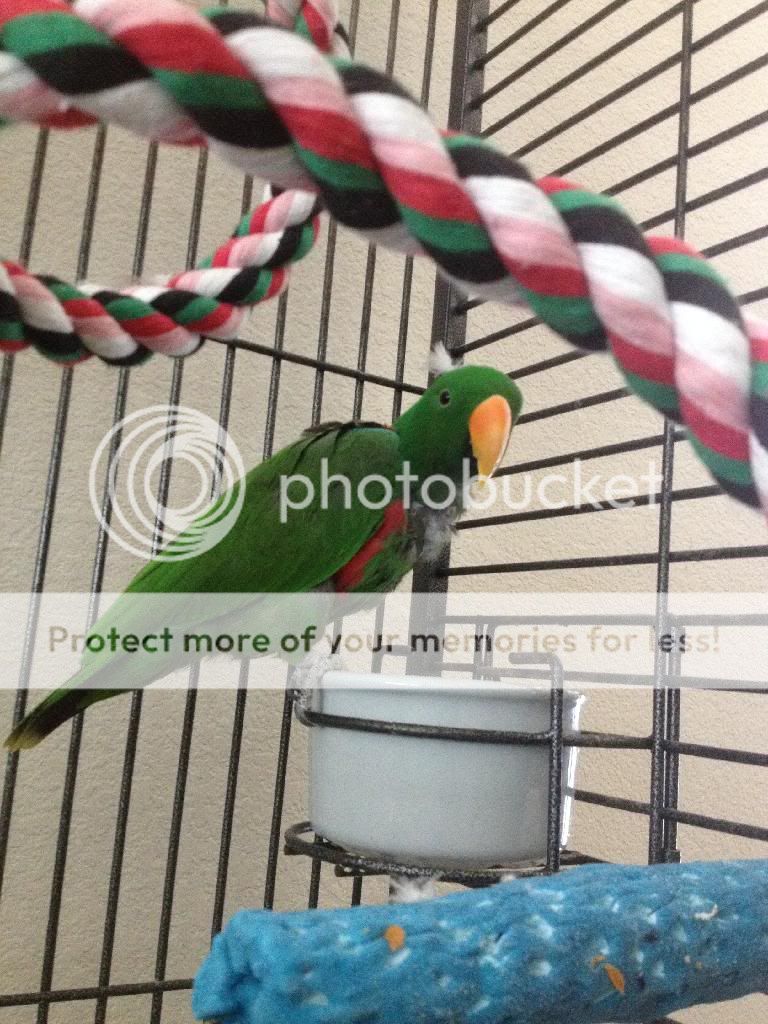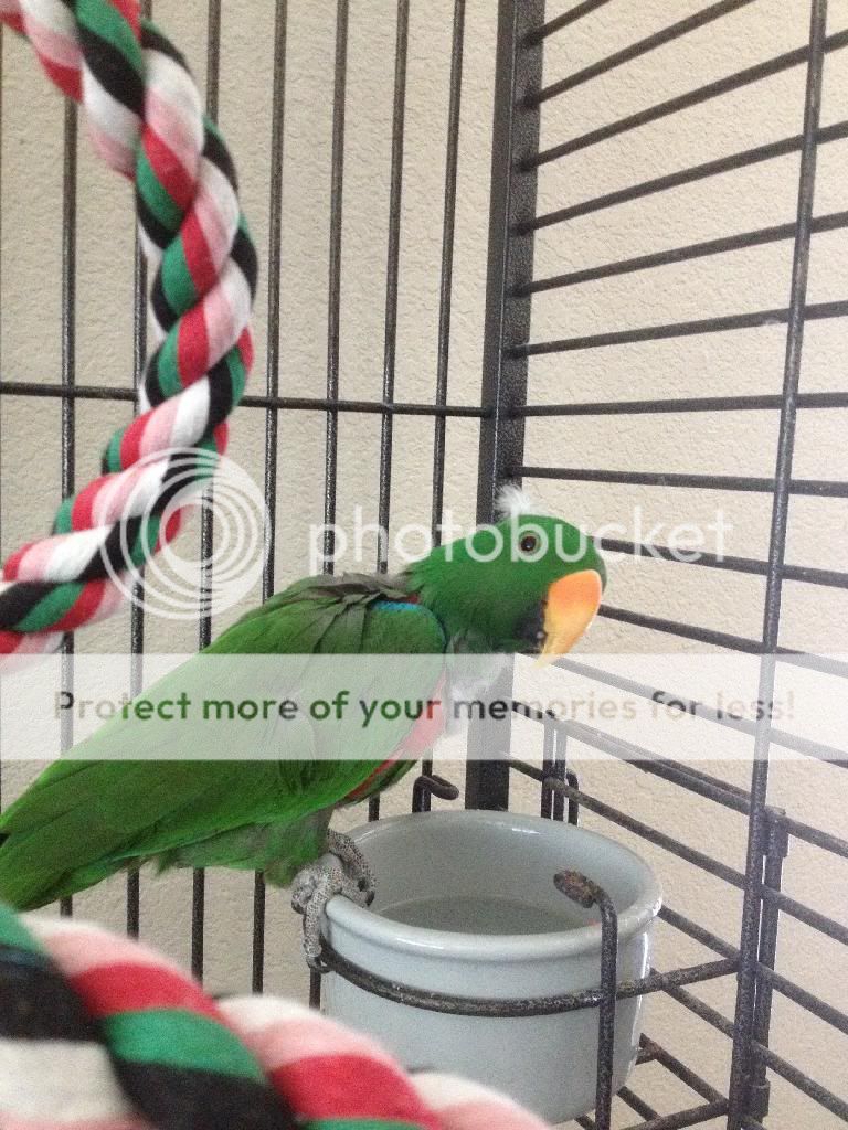 I remember reading that when an ekkie makes a mess of their food, it means it's good.. so I guess the post-breakfast cleanings should be a thing of pride, yeah? Hehe. This morning he munched down on some more cooked brown rice with shredded carrots, and since I've been doing side work over the weekend and haven't been there to prepare his meals myself(aside what's already in baggies in the fridge- my dad's girlfriend usually sticks to fruits and veggies for his food, just for simplicity's sake.) he hasn't had cooked food in a couple days.. and he was having it by the beak-full!!