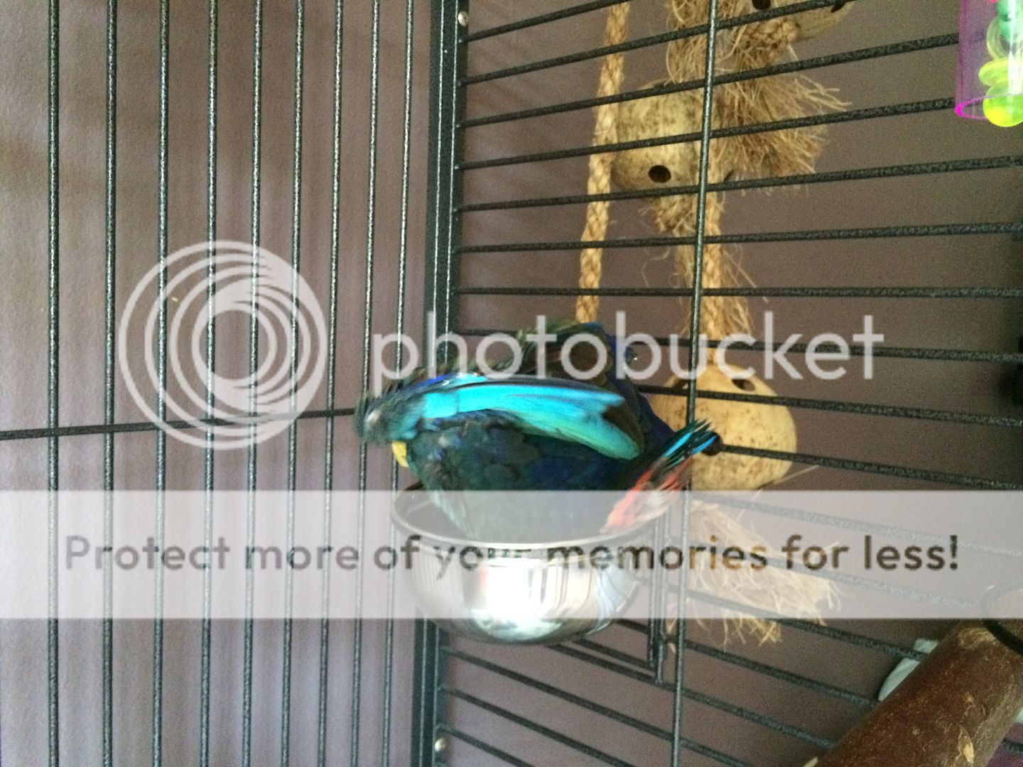 Raven in his "bathtub" Check out the turquoise underwings of Bronze Winged Pionus!