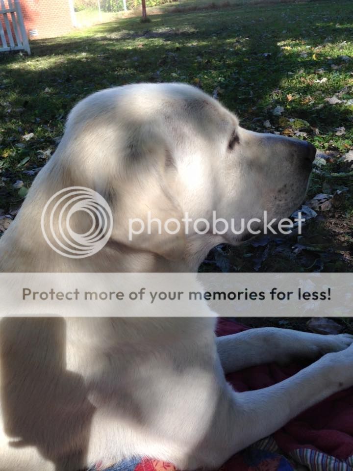 This is my boy, he is a huge yellow lab, almost white. My grandson named him Bobo and it kinda stuck.