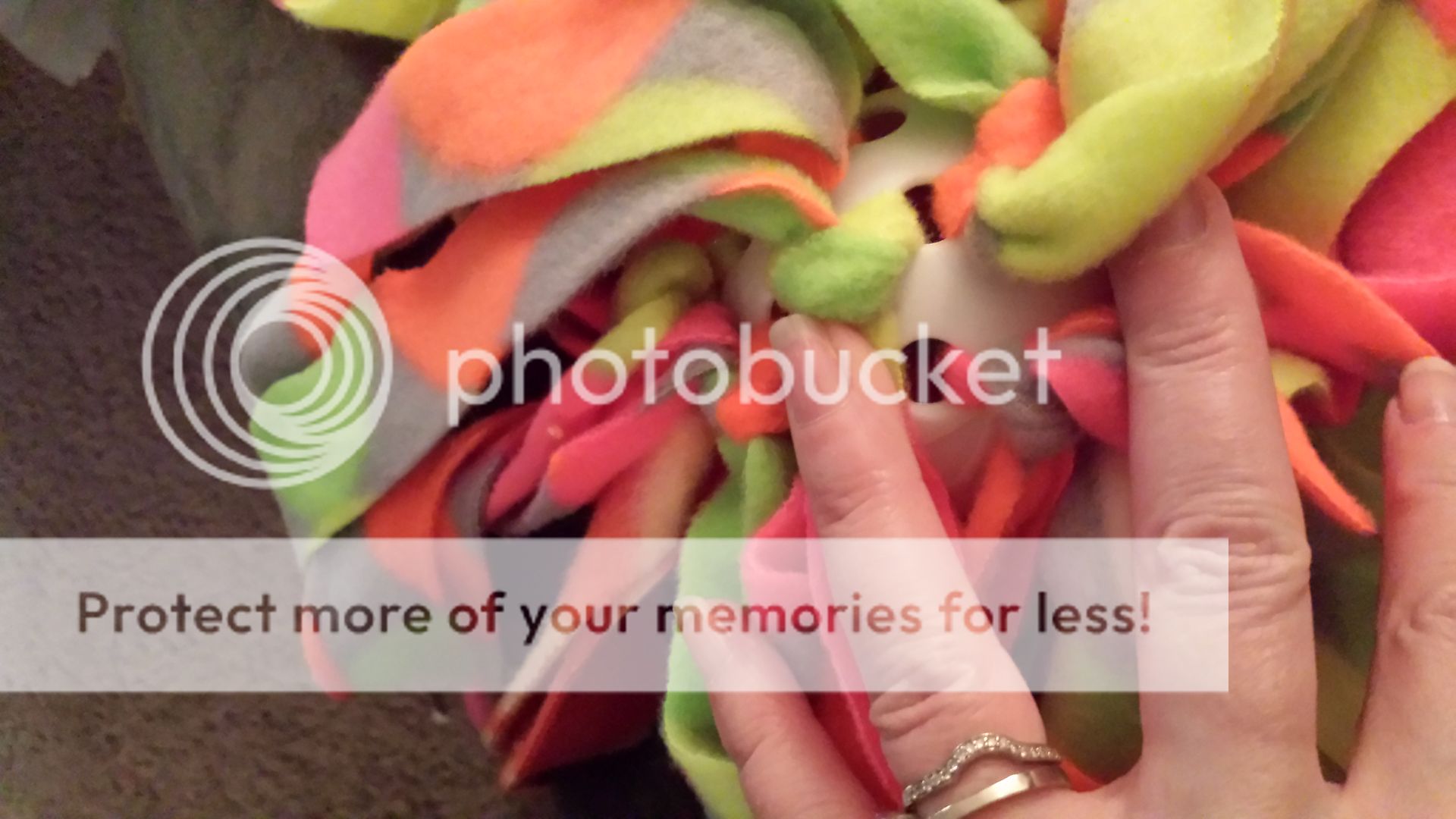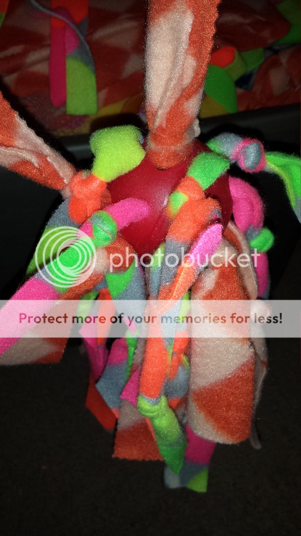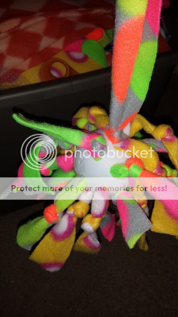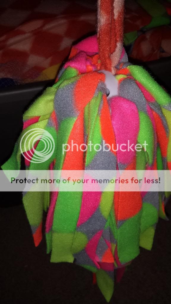 So, I was making a couple preeners for Loki after his surgery. I had a brilliant idea just literally smack me in the head (no, nothing was thrown at me).... Was had purchased a bunch of wiffle balls and had been playing with different options. Decided to feed fleece strips thru for a preener type toy.