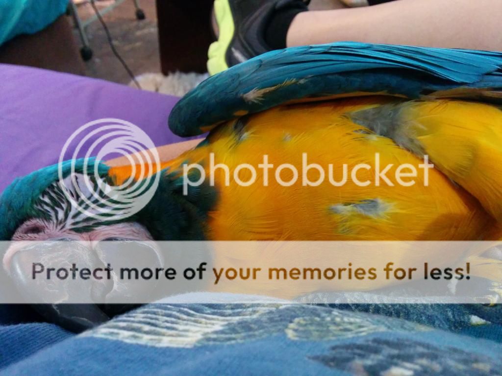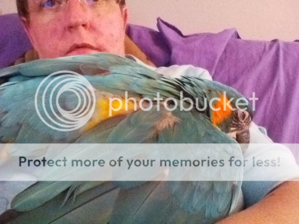 This pic she's doing the ball of feathers routine asleep on my chest. Excuse the quality, I was using the front facing camera on my cell phone, which was no mean trick while I was trying to hold her.