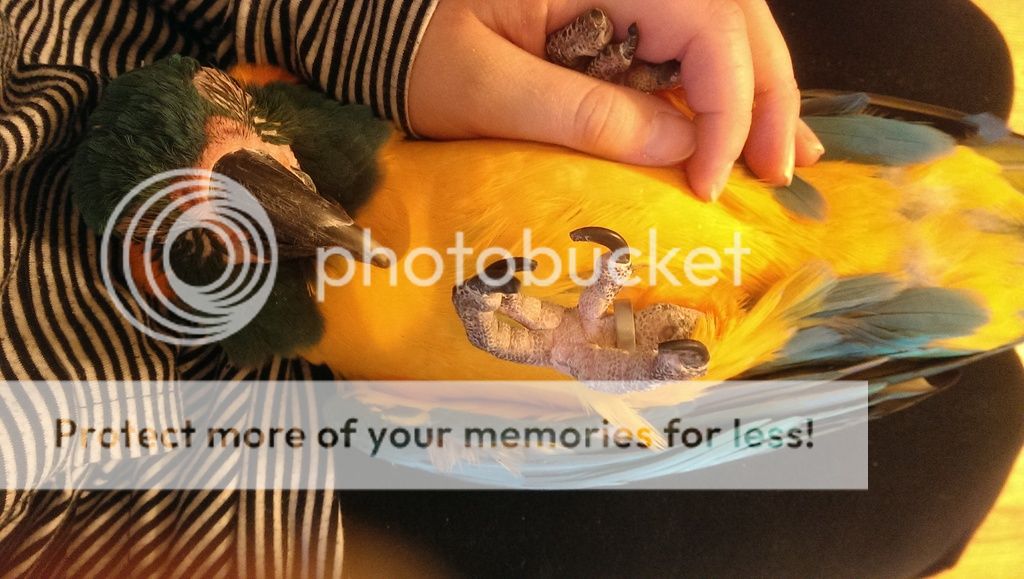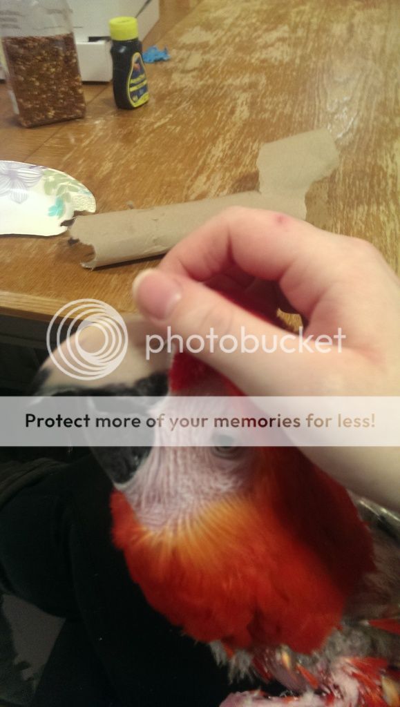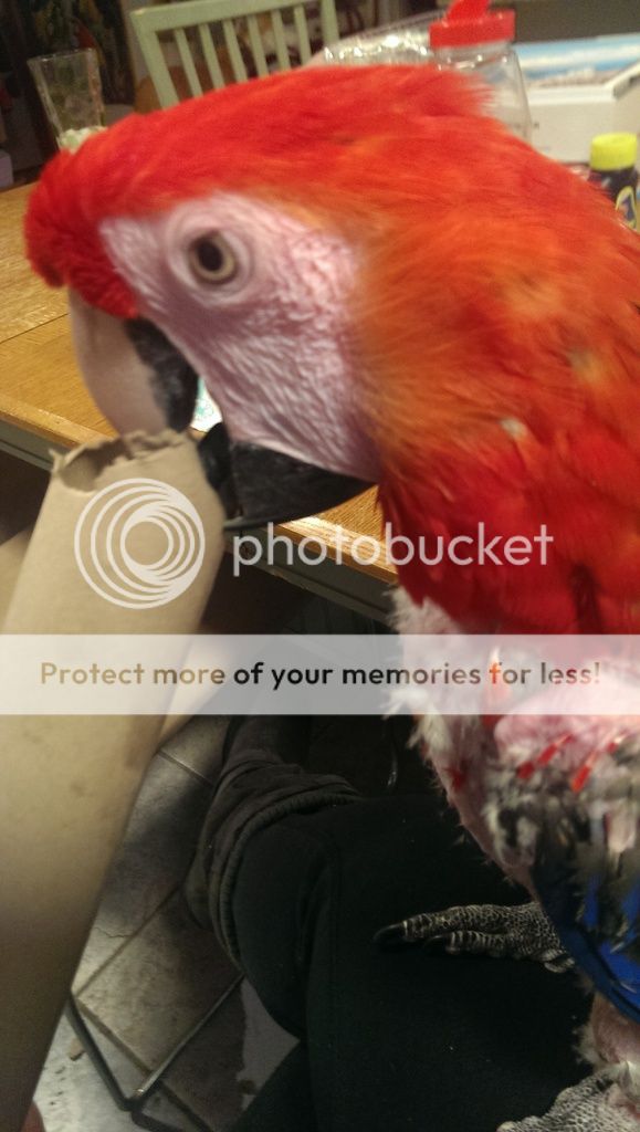 I didn't get many pics of Red Saturday since he was getting grumpy with all the people around and taking swipes from the stand when they walked by...he got put away a little early! He did okay with one of our adopters that was there taking home a macaw. He does like men a bit but he was still trying to eat fingers for awhile before settling with the guy.