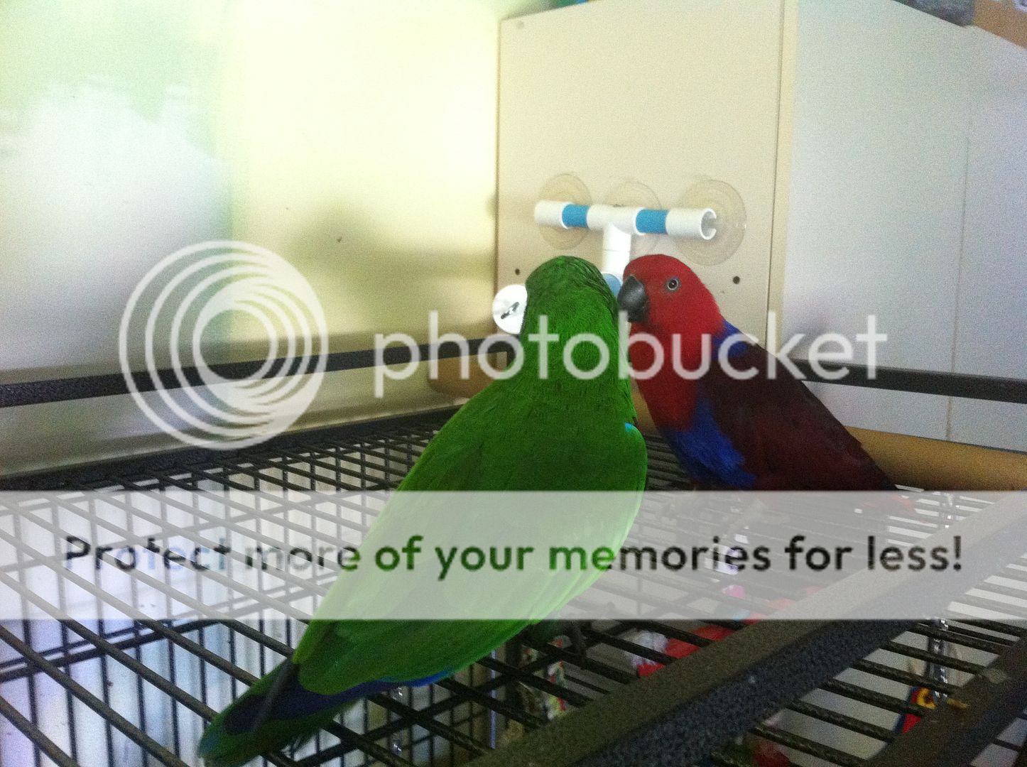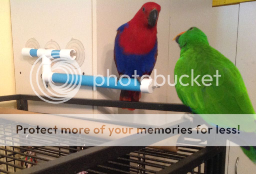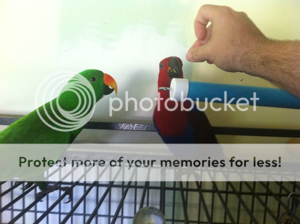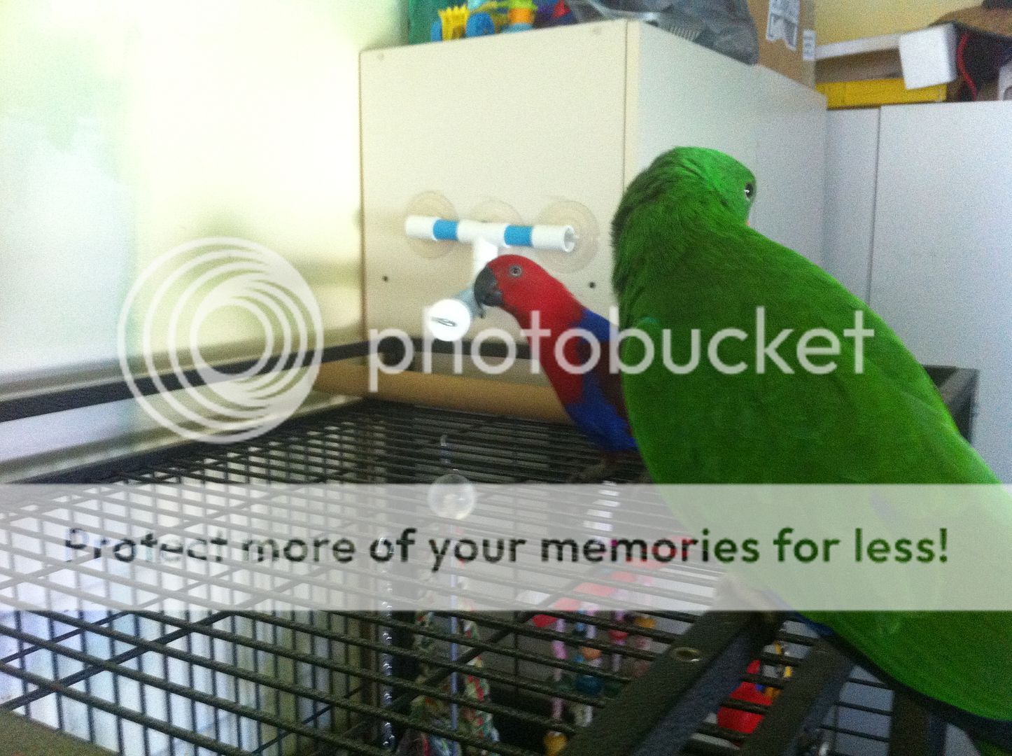 ), has anyone experienced their eclectus having a particular dislike to something of a particular colour. Even as I write this, I think it's a ridiculous question, but it's both Pebbles and Gizmo's complete rejection from the very beginning all the way through that is confusing me (I suppose something could have gone wrong in the introduction process, but introducing toys to them is nothing new to me, even big toys). I don't think it's the current sexual tension, as I have introduced other toys successfully in the last few months.Anyway I remain Gizmo and Pebbles perch for the moment, and drying post (have to change a sopping wet shirt at the end, and not from getting under the shower myself, from Gizmo running up my arm, drying off and then running back down into the shower again
