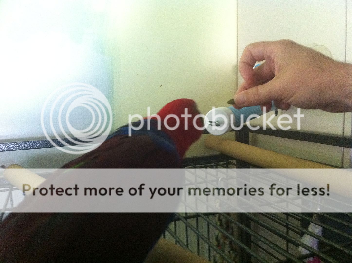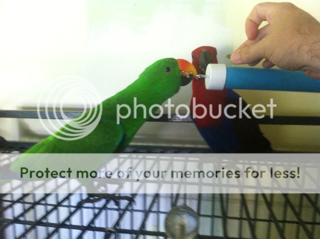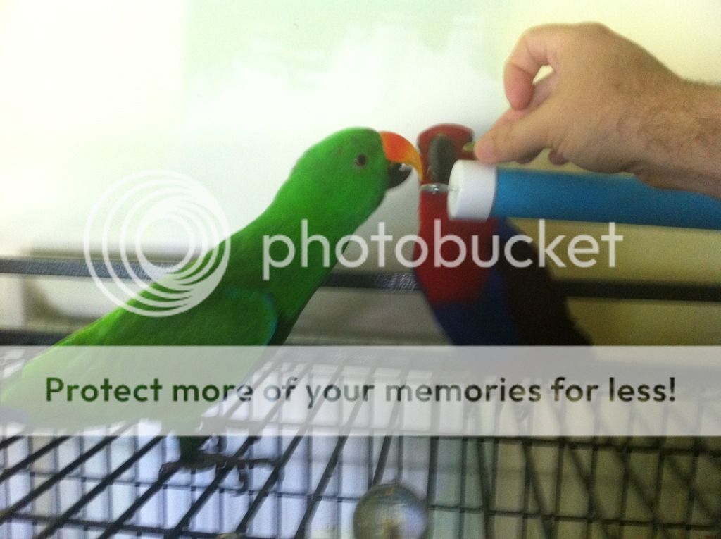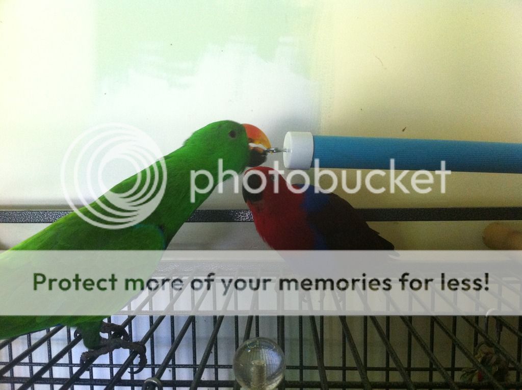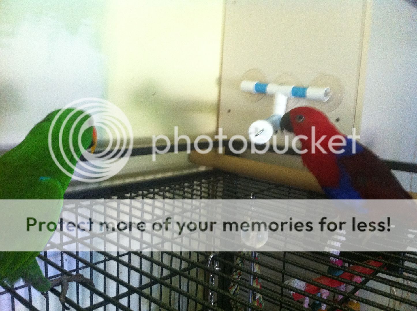 ), has anyone experienced their eclectus having a particular dislike to something of a particular colour. Even as I write this, I think it's a ridiculous question, but it's both Pebbles and Gizmo's complete rejection from the very beginning all the way through that is confusing me (I suppose something could have gone wrong in the introduction process, but introducing toys to them is nothing new to me, even big toys). I don't think it's the current sexual tension, as I have introduced other toys successfully in the last few months.Anyway I remain Gizmo and Pebbles perch for the moment, and drying post (have to change a sopping wet shirt at the end, and not from getting under the shower myself, from Gizmo running up my arm, drying off and then running back down into the shower again