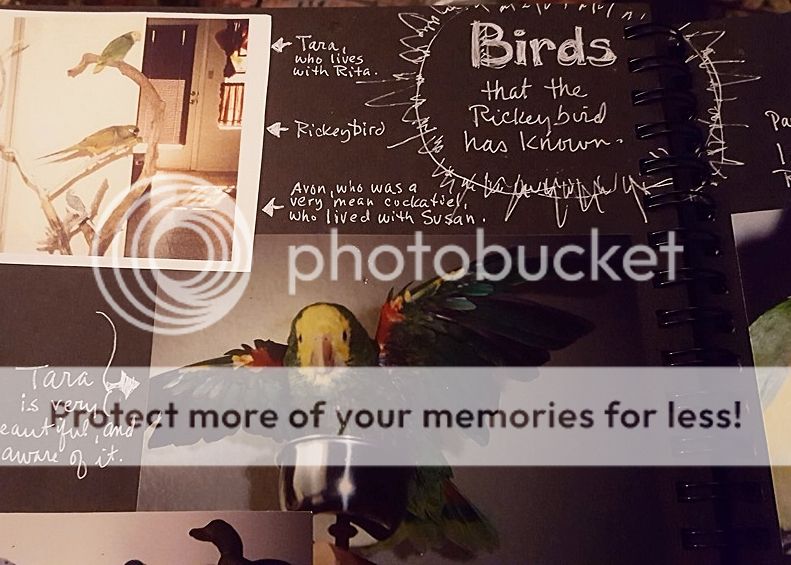 Here are two pictures of her from the Rickeybird Scrapbook, from the 1990s. In the top one, she was posing on a perch with the Rbird and a cockatiel friend. In the second, she is showing off by taking an impromptu bath in her water bowl. What a beauty. Inside and out.