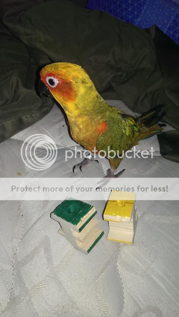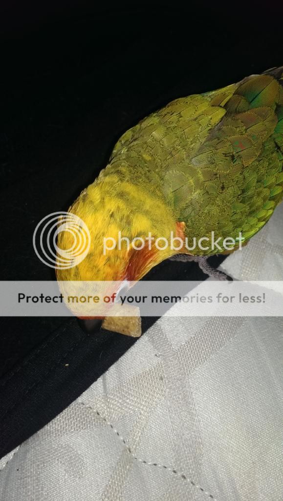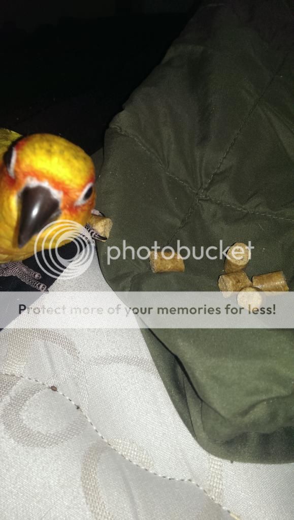 Loki my sun who has rebelled about the pellets since I brought him home has finally decided to eat the Roudybush! Apparently, I was feeding him the wrong size.....macaw size is what he wanted....talk about a bird who thinks he is much bigger then he really is! Should have guessed he would want macaw size pellets..he thinks Folgers foot toys are his size foot toys.