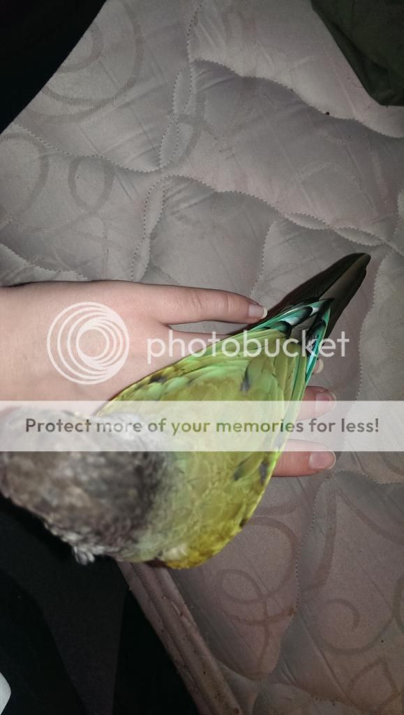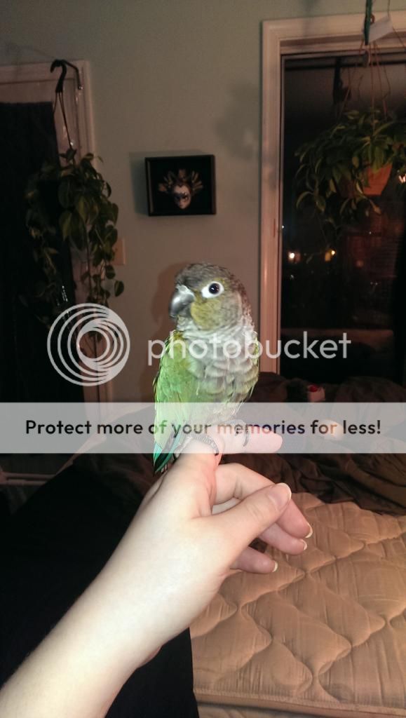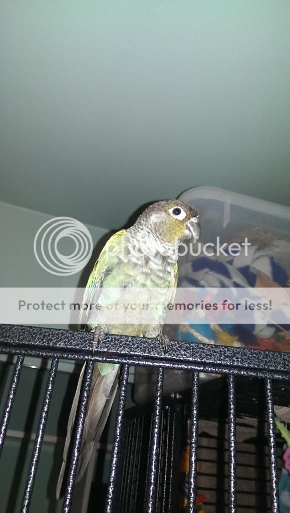 Next is Monster my male gcc! This is my plucker who I thought would do much better caged with my female and flighted...turns out I was right! He has stopped plucking and is no longer a super skittish bird. I think being flighted has helped him be more confident about his ability to get away if something goes wrong. He no longer jumps at every little thing. I have no idea why the following pictures make him look like puckish green. He is actually really blue...