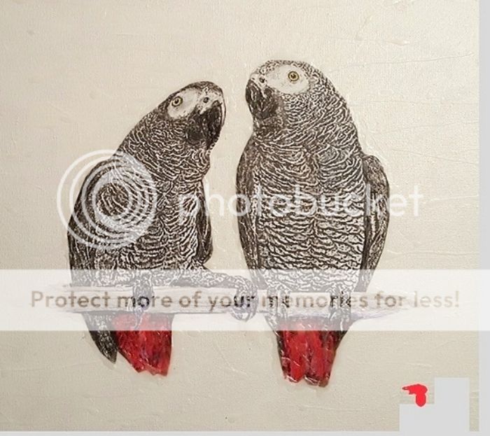 Some of you know that our member Marileen makes amazing crochet art, some traditional and some very innovative, such as 3-D "sculptures". She can make ANYTHING out of yarn, I think. Recently she offered to make me a Rickeybird, and I gratefully accepted. She absolutely refused to let me pay, so... in return, I used my art medium (painting) to make a portrait of her two African Greys, Harry and Toon, very personalized (with their different shadings and postures, as well as Harry's "special" foot). We agreed to post our portraits here, in thanks to everybody for making this a community where stuff like this can happen, and also to show off our boys!