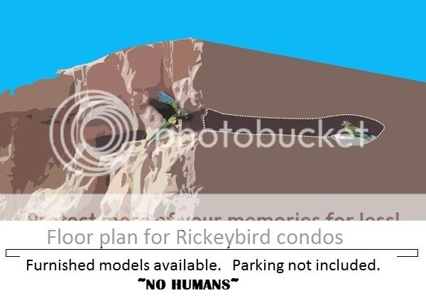 Here we have available state-of-the-art new housing for Rickeybirds in their native Patagonian limestone cliff burrows. (Courtesy of a Chilean research/conservation project; note... I borrowed one of their graphics... the humor is all mine. THEY'RE a very serious project!)