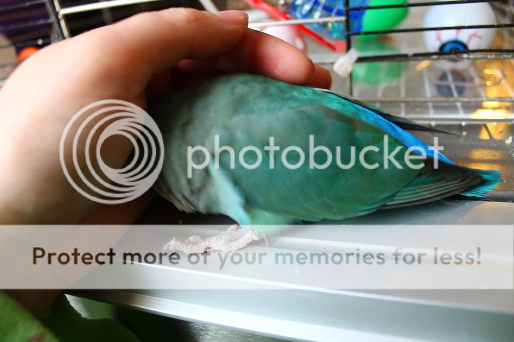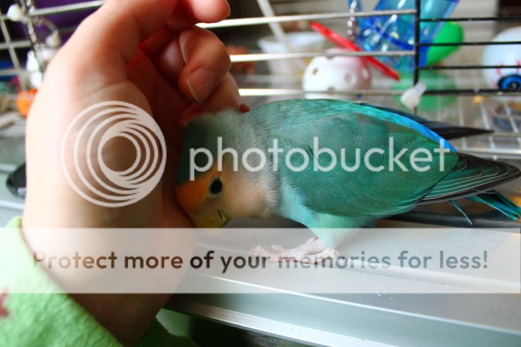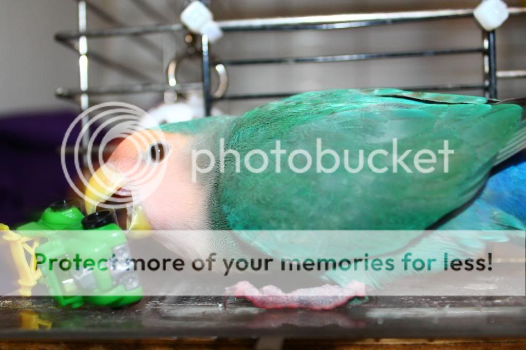 this one... does anyone else think of the T-rex from Jurassic Park when they see this photo? Jurassic Park is banned in our home. Because of Munch. When it was on, she got all excited and kept calling back to all the dinosaurs. Now we know why... she wants to be a T-rex. Or maybe in her mind, she already is one. who knows with her!! But, I gave her a small plastic toy car (from a Kinder Egg Surprise, for those who know what they are). It has no metal bits or anything too small for her, but she is having a riot with it, throwing it around her cage and wrestling around with it.