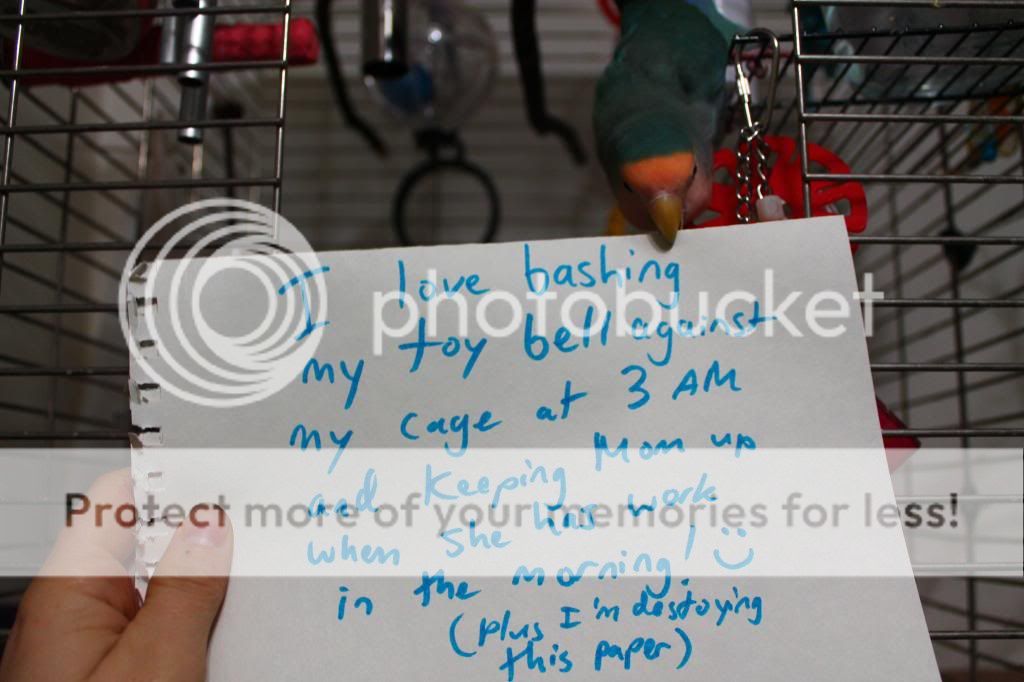 and then Tuesday night/Wednesday morning. I had a hard time sleeping and I had to get up early for a day shift at my work. So I forced myself to go to bed around 2:30-3:00 am and that's when Munch decided to get up, despite it being dark in the room, and start bashing her bell around. and I mean the 4" SS pipe bell she has. right against her cage wall for hours on end. then run over to her rattly toy and start bashing that as hard as she could. back and forth back and forth between all her noisiest toys and making a huge ruckus. why? because that's how she plays from the moment she wakes up to the time she goes to sleep. is noise noise noise. but i sat there for hours trying to fall asleep and she still just kept going on and on. i managed to fall asleep at 7 am only to have my husband come home at 8 am and wake me up to get ready for work (husband works midnights during the week, i work midnights on the weekends).