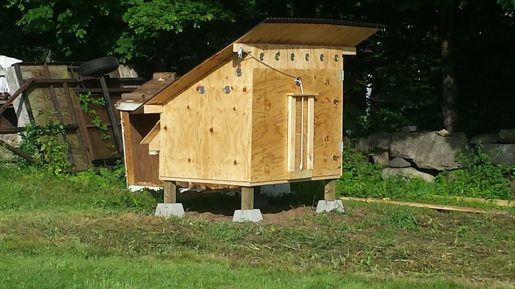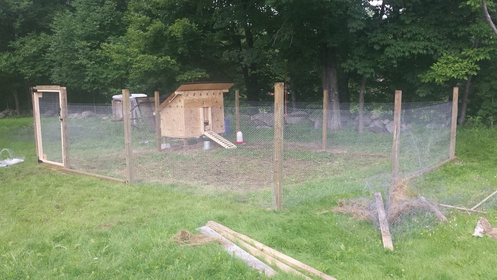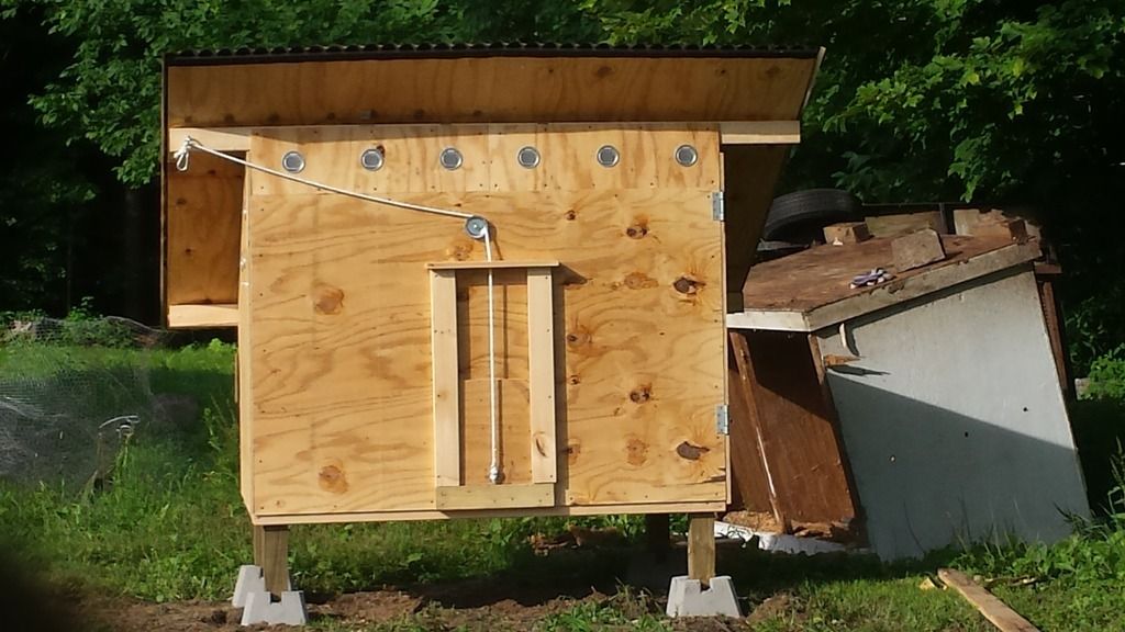 Well, new coop is MUCH improved, much easier to clean out, 4 proper nesting boxes in their own compartment (in the back) better ventilation, higher off the ground, guillotine door, roost-style ramp so crap doesn't freeze on it, and VERY strong. (I'm over 300 lbs and can stand in it.) New yard is a tad bigger as well, went from 20x20' to 24x24', and have a much better designed door to the yard.