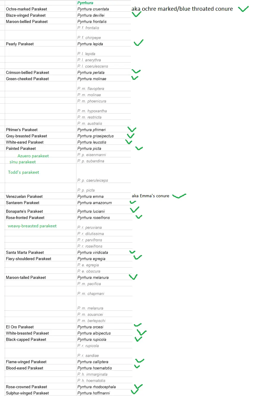 nope, not all. I'll mark in few minutes which has been mentioned.Okay, this is the whole list of Pyrrhura, but I think these have all been mentioned already.