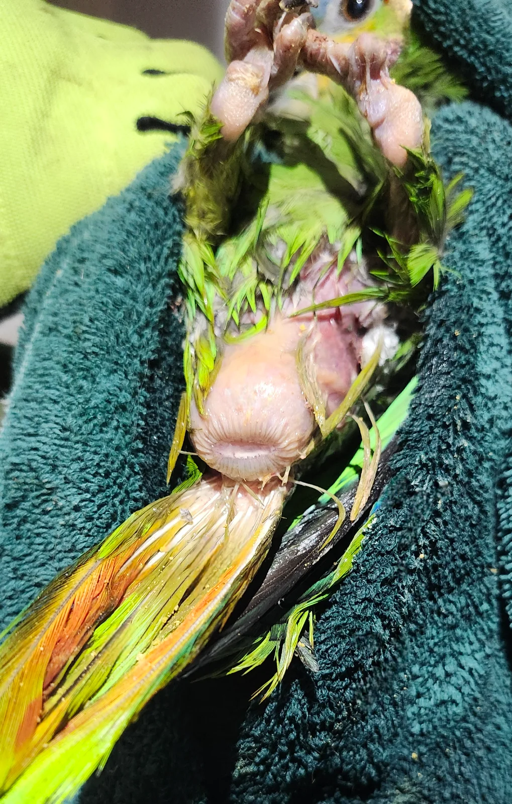 Still eating okay, still perching, a little blood in droppings, nothing visible in fecal under microscope to identify problem, making a long sound occasionally with wide open beak -stress, pain? with vent trying to open due to constipation? More urate liquid than green poop. Have lavaged with warm sugar/honey water and applied KY. Pic attached