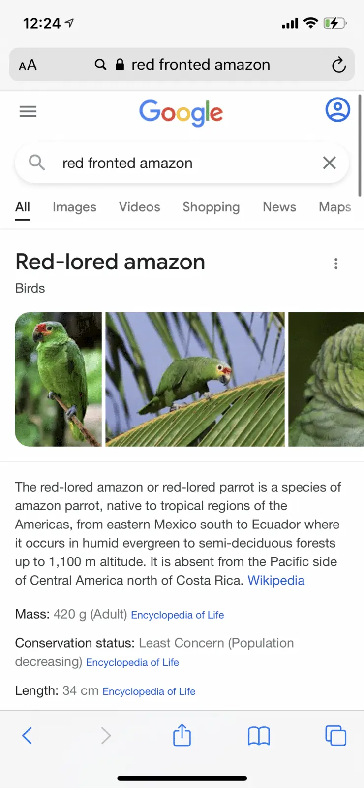 you see - you wrote "red fronted amazon" but your results are "red lored amazon". It's because "red fronted" doesn't exist in English and "red lored" is the most common species with word "red"What do you mean?..