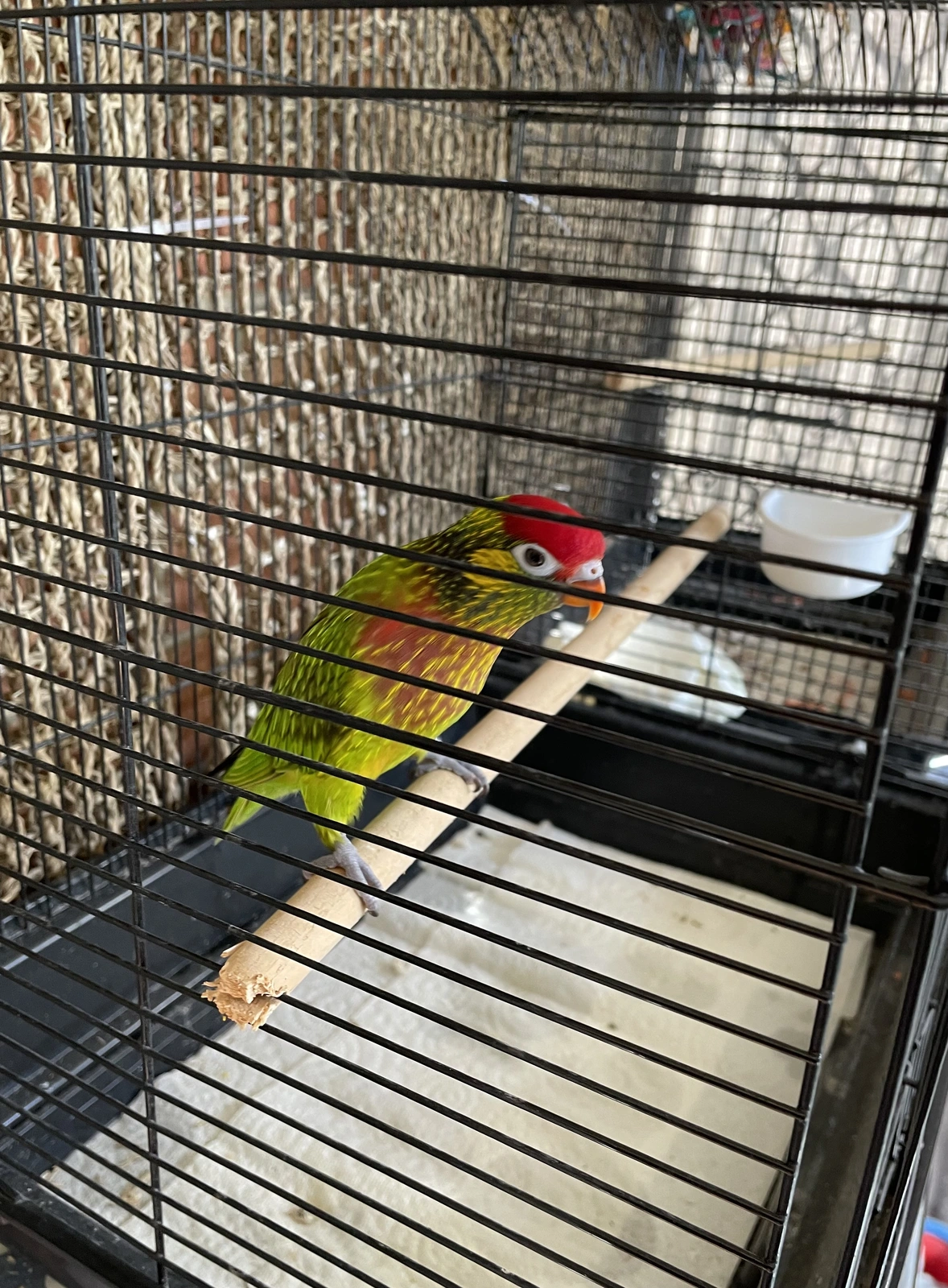 Poor baby, he's not happy about being caged while we go pressure-wash the cockatiel's cage this morning so he's taking out his frustrations on his bell. Little does he know it's gonna happen again tomorrow when we clean his and Peachie's cages!!