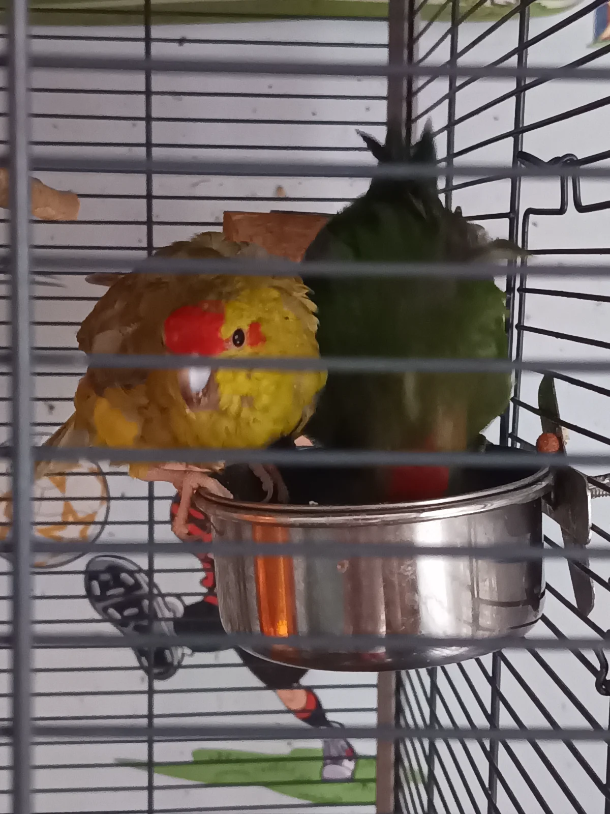 Hi everyone! This is my forst post here. I have 4 kakarikis, 2 siblings and a couple. My main concern right now is Ami. She is 1,5 years old (estimated). Back in september-october she was at the emergency hospital for one week because of unknown (either poisoning or some illness she was born with), either way she got better after a while, and then we noticed she laid eggs on the bottom of the cage. That has been dealt with, she got fake eggs (advised by the vet) sat on it for a while. But then I had to go away for a week to a trip, and I left them at the care of my parents. They ended up getting mites, probably from some stick from outside, she got better, her feathers look good, her little boyfriend still looks a bit rough, he's going for a check-up tomorrow. After she got bored of the fake eggs, they started "mating" again, and she ended up double clutching 4 eggs. We separated her and Heszi, the boyfriend, Ami is in their usual aviary, and Heszi is in a cage next to her. We have a camera in their room, so I can see them when I'm not there, and the past 2-3 days, I noticed that when she sleeps, she doesn't sleep on the perch like she used to, but rather on her drinking bowl. It's a flat wooden platform with 2 holes where the bowls go in, (which she loves to chew apart by the way). It's at the top of the cage, one bar higher than the top perch. I am kinda worried that maybe she is getting sick again, and she can't hold herself properly or something. But also a lot of things are happening right now. She double clutched, they're separated, she laid the eggs not too long after she was really sick. Does this seem like a big problem, and I should schedule a vet visit tomorrow for her too, or can I wait it out, talk to the vet about it, and risk the only next potential vet visit be on monday. I also noticed that she rests a bit more recently, I don't know if it's because I'm paying attention to them through the camera more, if it's because they're apart and she's less energetic without him, or I'm just way too stressed and going crazy. The pic I attached is a month old, it also shows the drinking bowl she sleeps on in the background. I hope my rambling made sense!