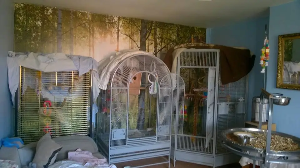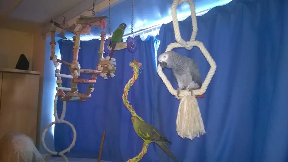 - Indoors, African Grey (Bessey), Rock Pebbler (Flippa), Blue Headed Pionus (Pi) & GC Conure (Chirpy)