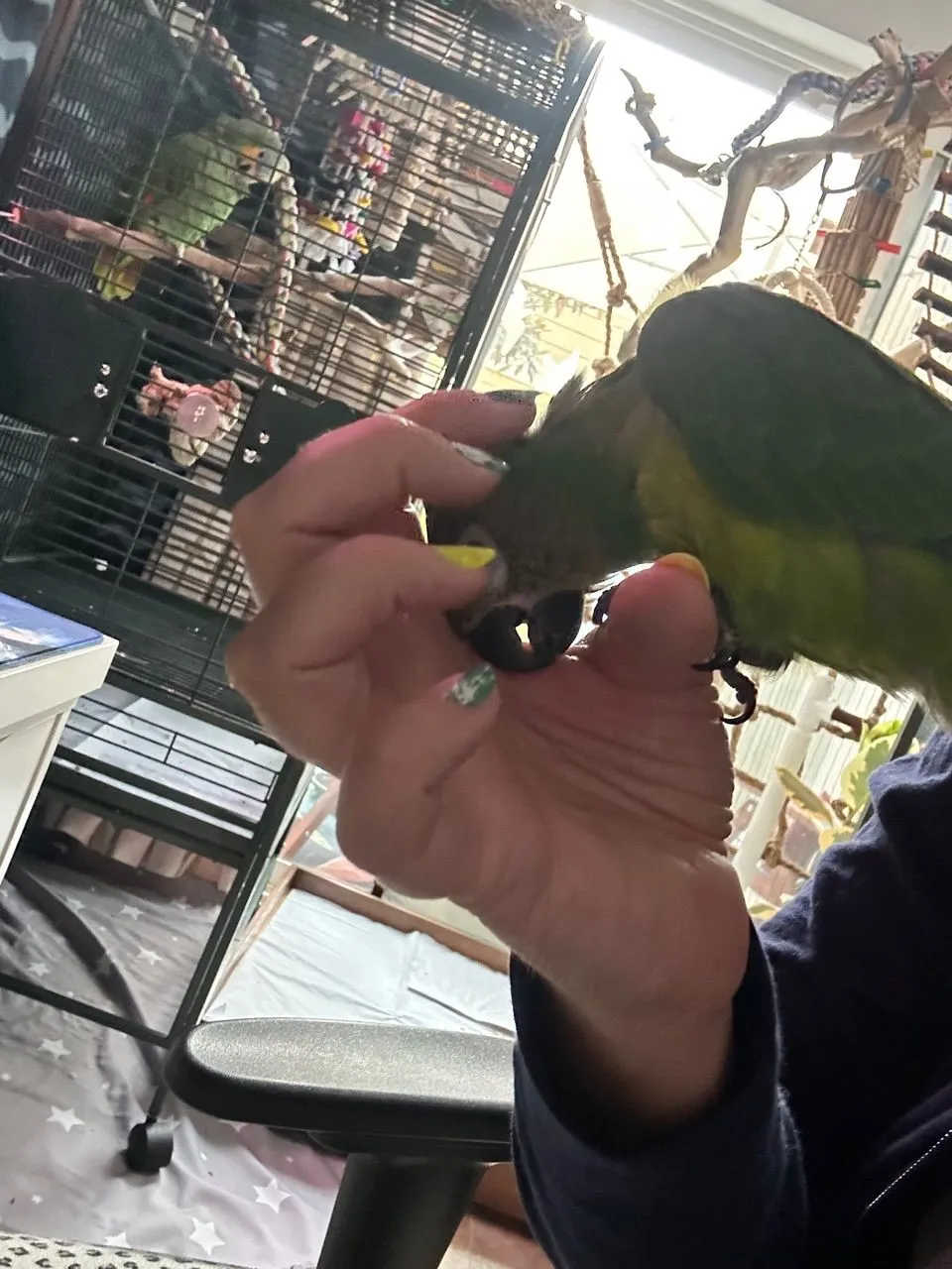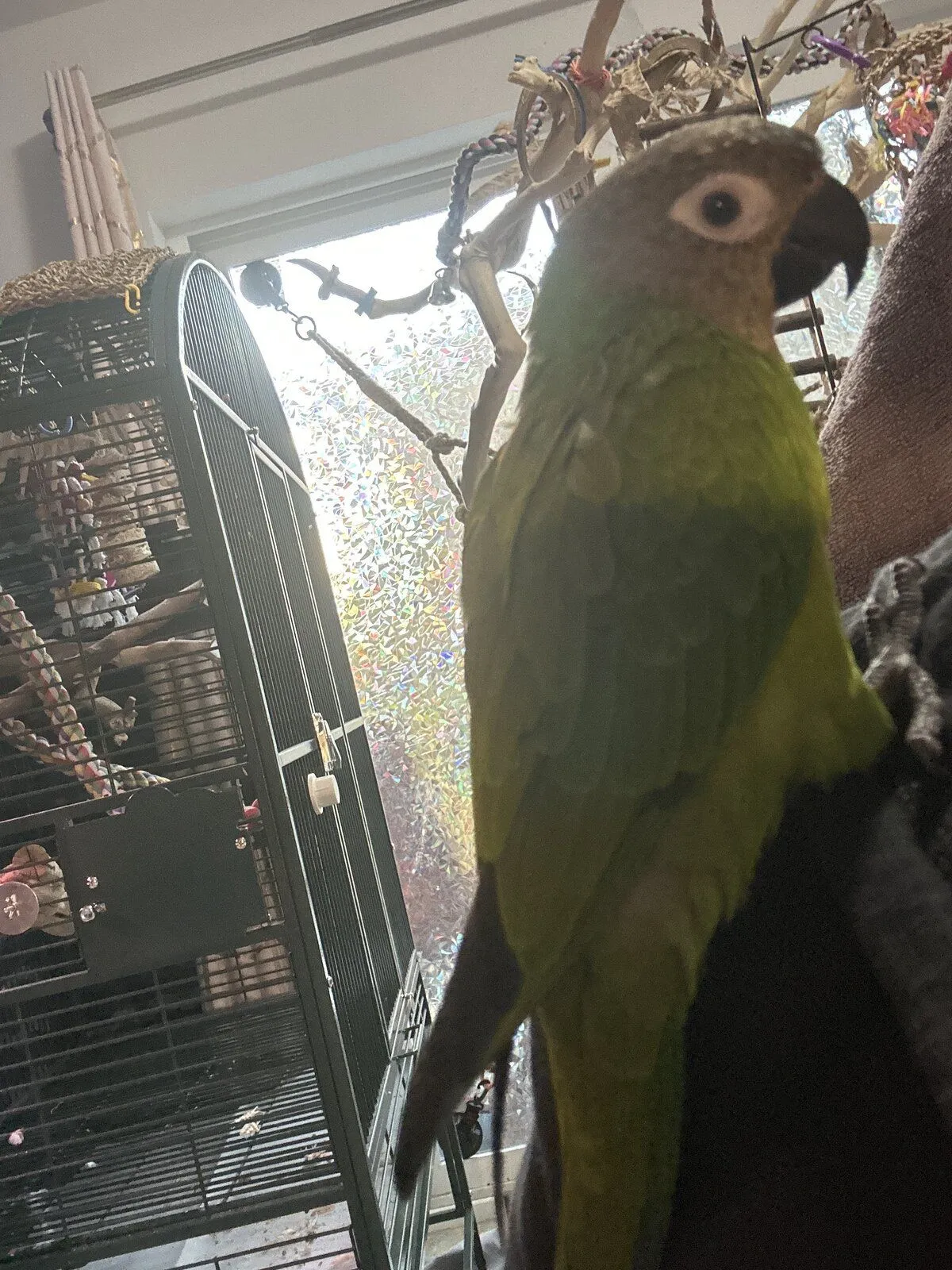 Tough day for Broccoli. In spite of the net, the fact that the windows are rather dingy, and one side even has a screen over it, Broccoli has hit the window a couple times. Today he flew off my shoulder (I think a noise startled him) and did it again and ended up on the floor, alert. He immediately flew back to me for reassurance, but this was his first time he’s really struck it and I am beside myself with worry!