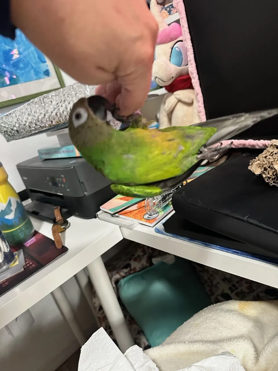 Both birds like the edamame! I think today whilst Brocc is out I’ll swap out some of his toys with the new one. He seems to get bored of them quickly, judging by the amount of shrieking he does at me every time I leave the room.![]()