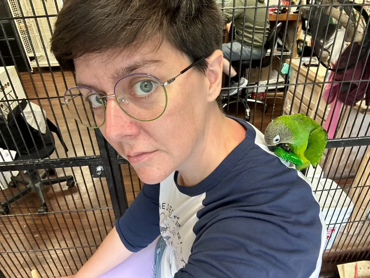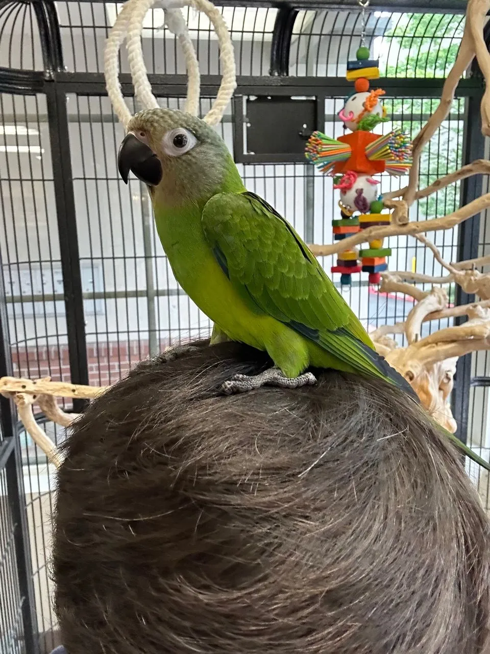 She is still a baby baby, so she steps up and when she flies off just does so to land on my head, haha. She also lets me gently hold her to my chest when itās time to go back to her cage. We hung out for about 45 mins and she was happy to sit on my shoulder and play with foot toys and chew wooden blocks.