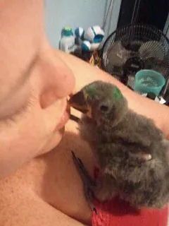 Shrek has discovered he has wings and there getting to be quiet long wings.. he will run as fast as his big ol feet will take him flapping his wings and climb up on his stuff animal and jump... ... lol its quiet funny! HE is getting feathers along the edge of his wings now and the color is just beautiful.... he will dive into his food if im not fast enough, and run if he is set away from me to get to me... he will let us rub his head or neck or anywhere we chose and he will just relax and fall over into you while ur rubbing him .. He is so loveable and has started kissing me, and i finally for a picture of it.