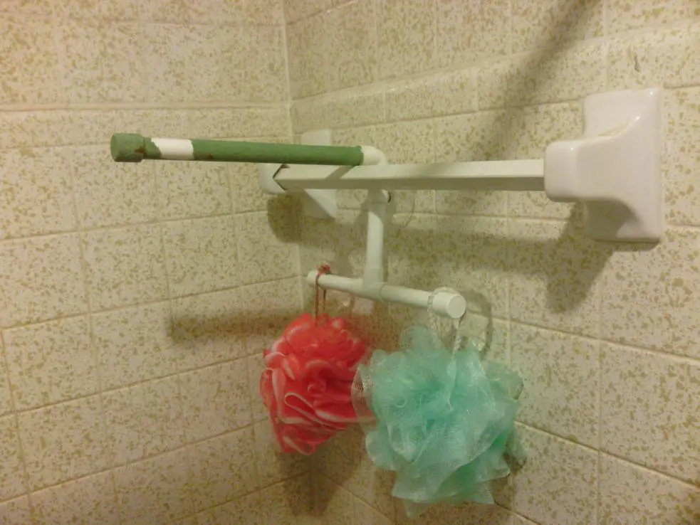 Now that might work! I don't have a towel rod or anything like that in the shower..but! there is a recessed area with a stainless steel handrail..I tried and it does fit down in there..feels like it should be secure enough that he's not going to pull it out..Thank you! I will be testing this out tomorrow.