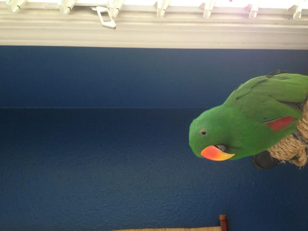 Does Rumi need a beak trim? His beak looks a bit long to me. My female does a much better job of keeping her beak trimmed, but he doesn't seem so good at it! Do I need to take him to the vet for a trim? I have no idea why the attachment is rotated...