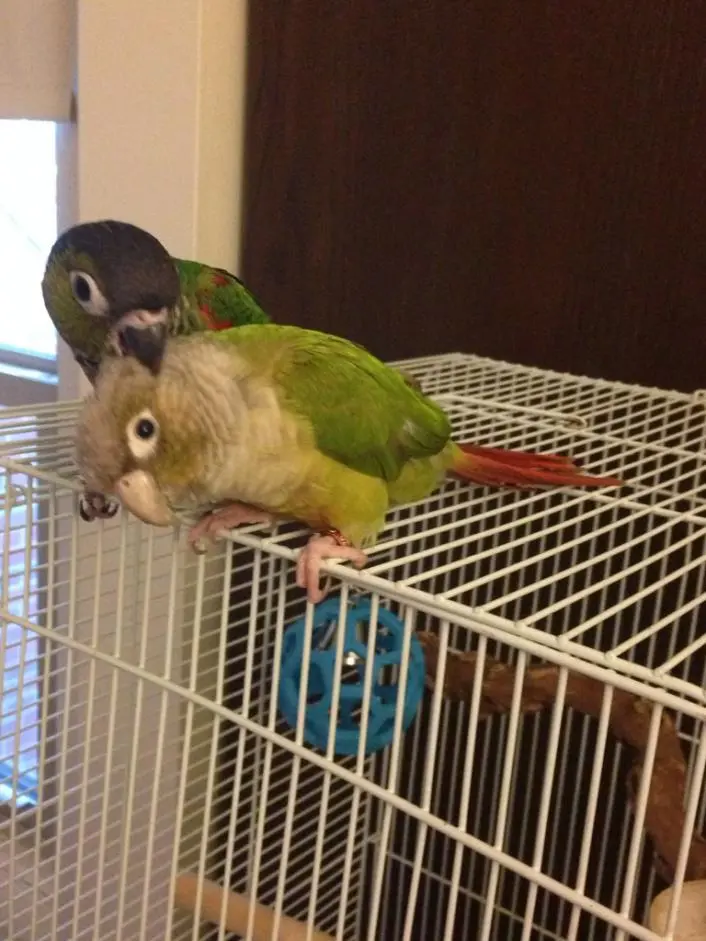 Needless to say the Petco near me had two Black Cap Conures caged together and I finally gave in on Friday. I picked the one who didn't bite when I held him. His name is Raj and he is almost 4 months old. He is scared of hands but loves faces. The only unfortunate thing is my kids broke quarantine. I had Raj out if his cage and ran to the bathroom quick. When I came back in, on of my kids had Chico in the room on Raj's cage. I was freaking out. Luckily it seemed like love at first sight and they were preening the pin feathers off each other. He has already been tested for all the big P's but I'm still going to be keeping with quarantine, keeping my fingers crossed, & reminding my kids why quarantine is important. Pics coming soon.