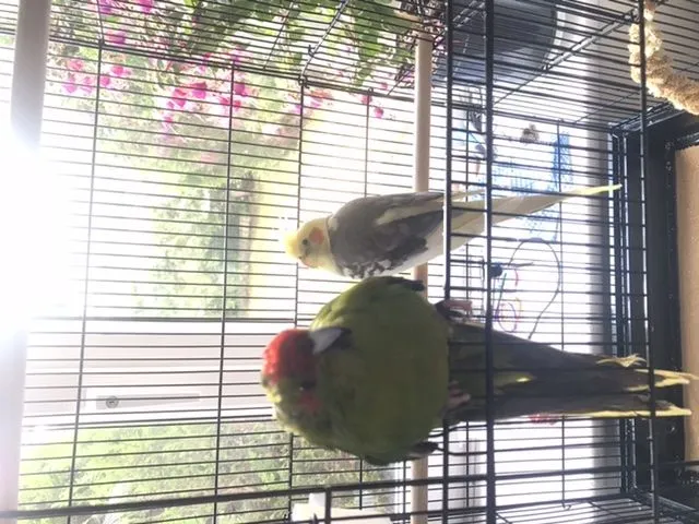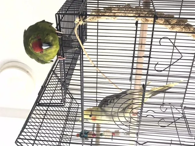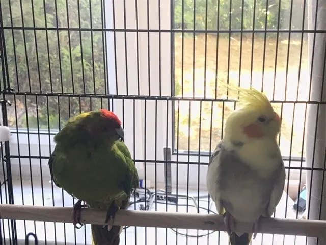 - Kiwi (Red fronted kakariki) & Collins (pied cockatiel)