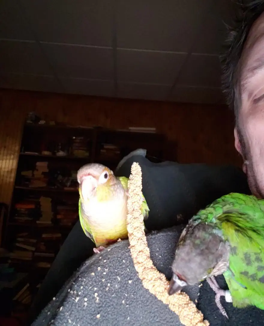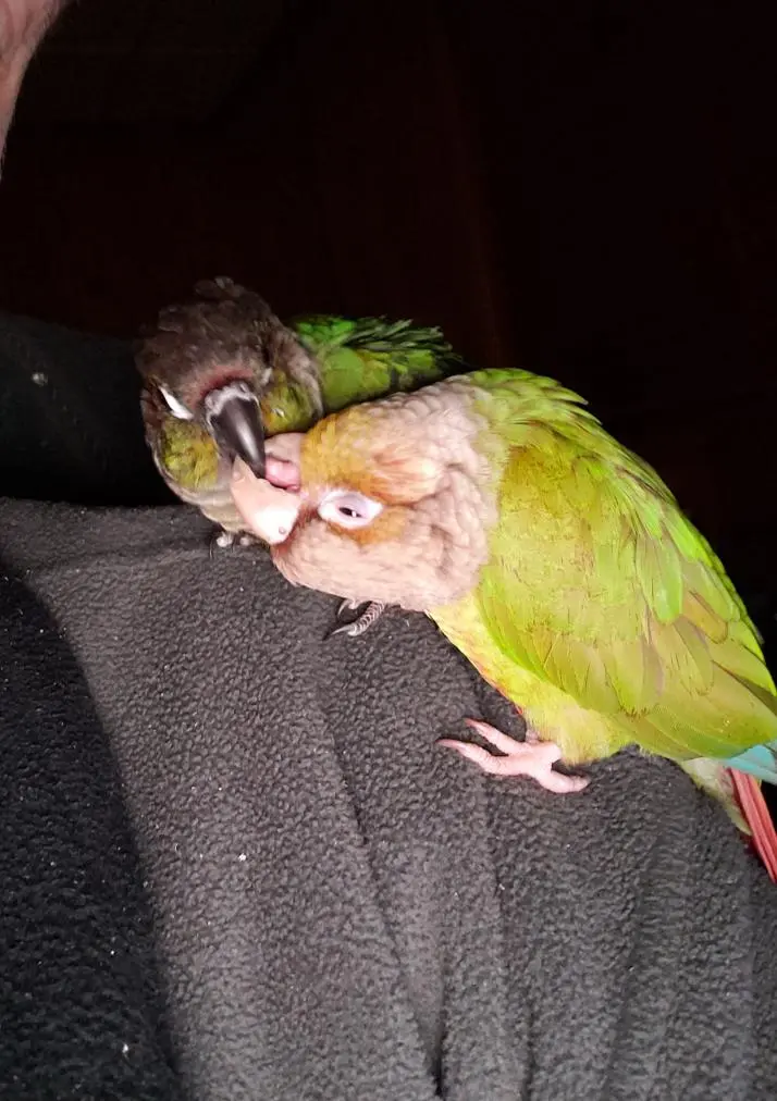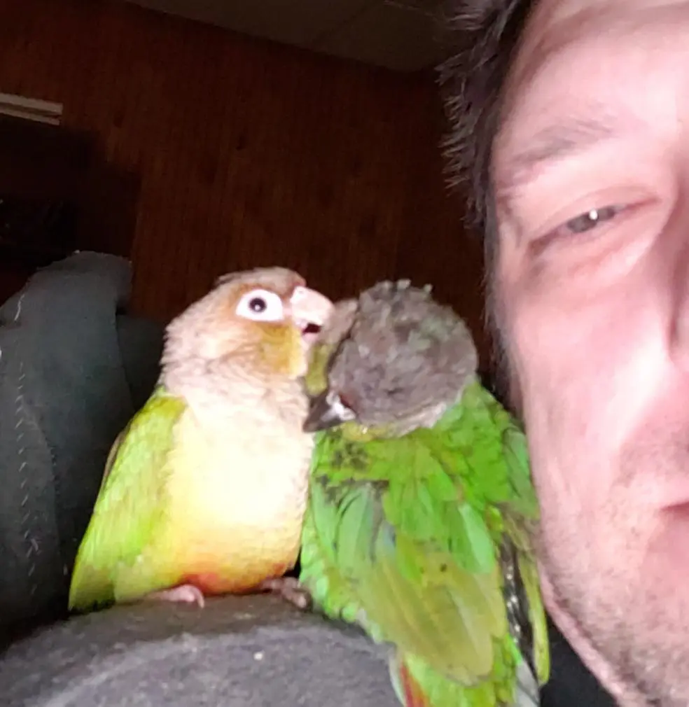 - A crossover Quaker Scuti (F), A Sun conure named AC, A Cinnamon Green Cheek conure Kent, and 4 budgies, yellow (f), clark Jr. (m), Dot (f), Zebra(f). AND 3 BABY BUDGIES.