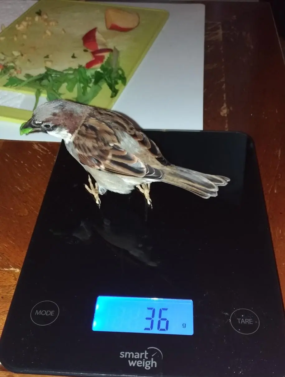 My 6 year old House Sparrow, loves to eat. Probably too much. His weight today, 36grams!