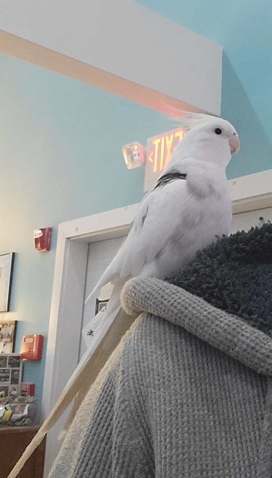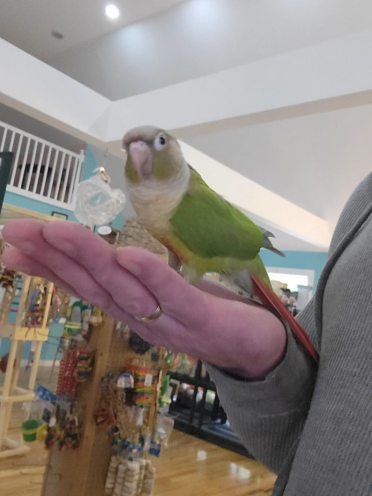 Anyway, I was sitting with Avery on my arm, and a little conure just appeared on my shoulder! Super sweet baby. Avery was fine with it until the conure walked down to meet him. He wasn't thrilled, so I switched arms and put the conure back up to my shoulder. Then... The most gorgeous little tiel appeared next to him, stuck his face in my ear and started whistling. Not like a wolf whistle or anything, I'm talking full on songs, complete with the vibrato on the long notes. Seriously, Roger Whittaker level stuff. I just melted.