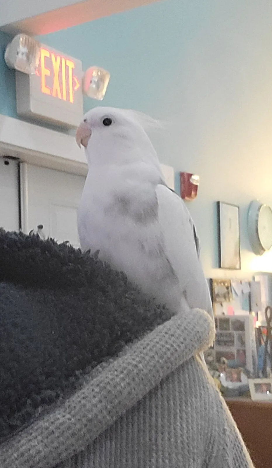Turns out the two are a bonded pair and will have to be adopted together. If you move one out of sight of the other, they both panic and contact call. They're still super young too. They have separate cages, but spend most of their time out together. The tiel is all white except a little grey on his chest and a couple grey patches on his back. I've never seen one like him, he's absolutely stunning. OMG my heart!